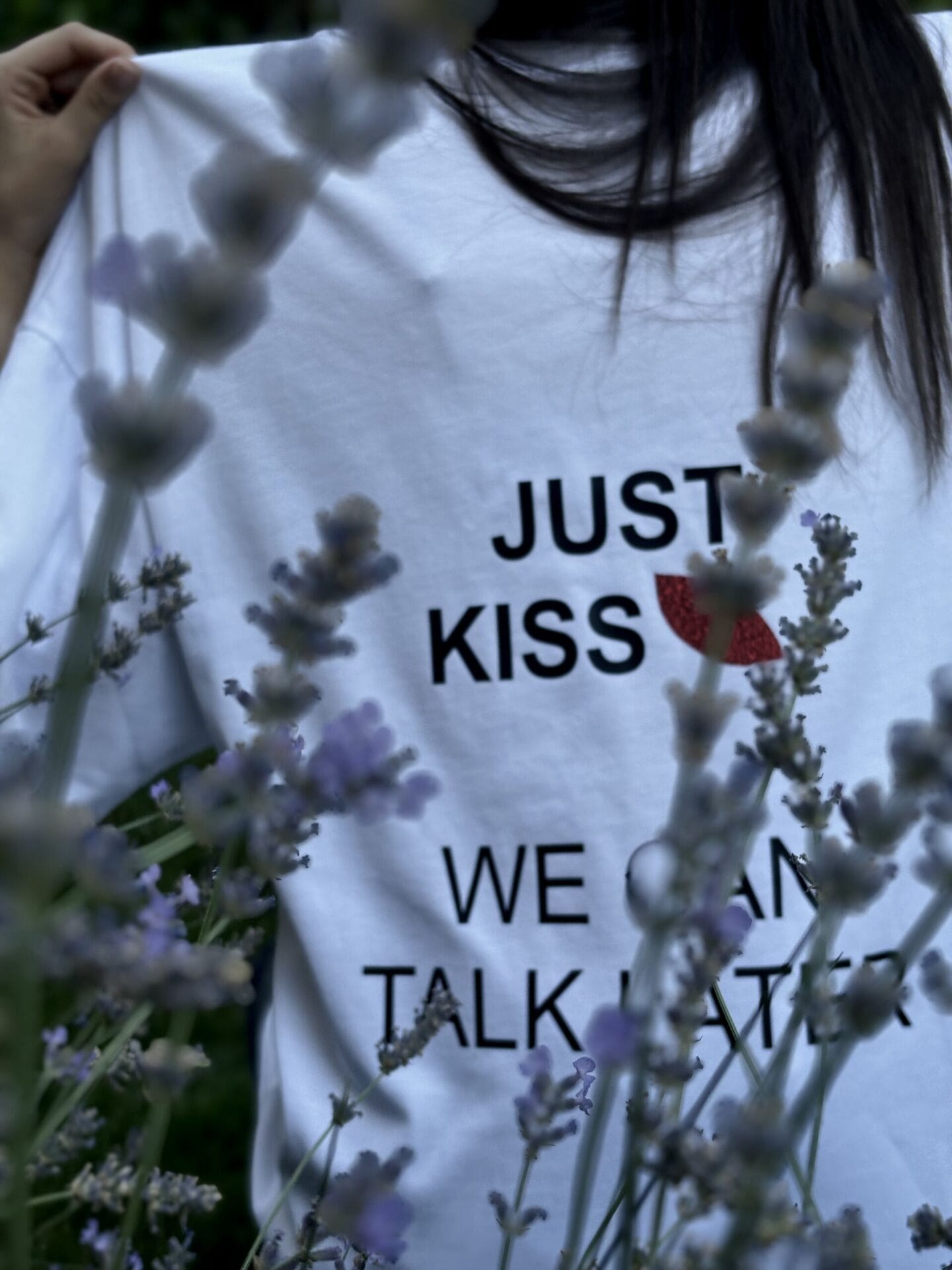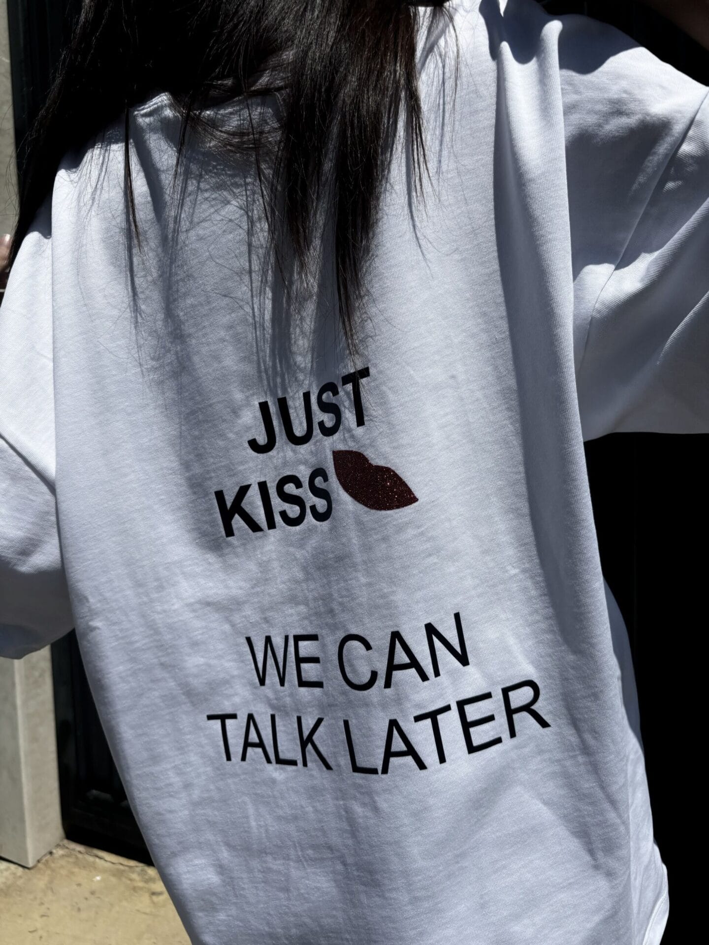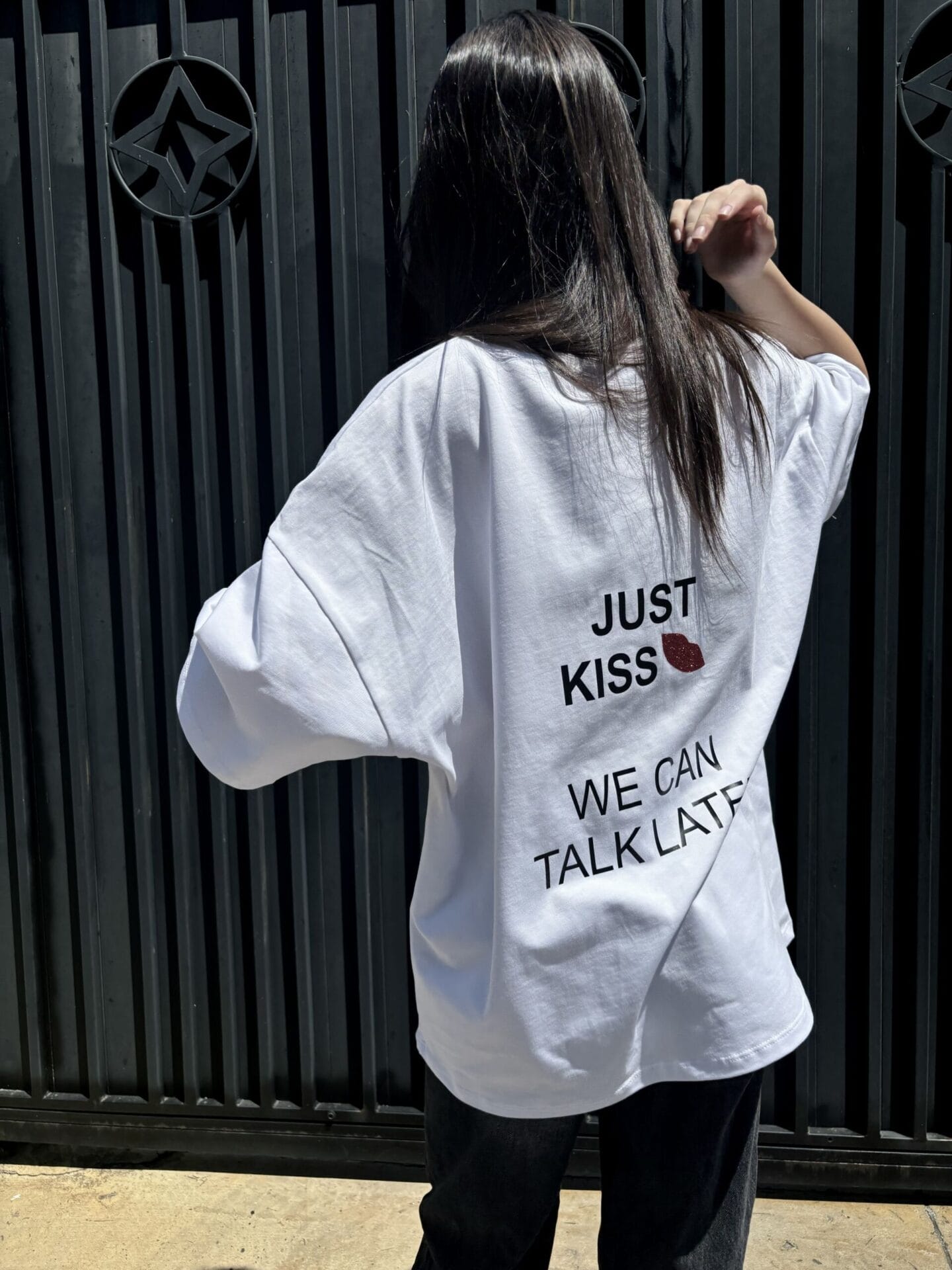 Дамска бяла тениска с щампа. Широк, уголемен модел.