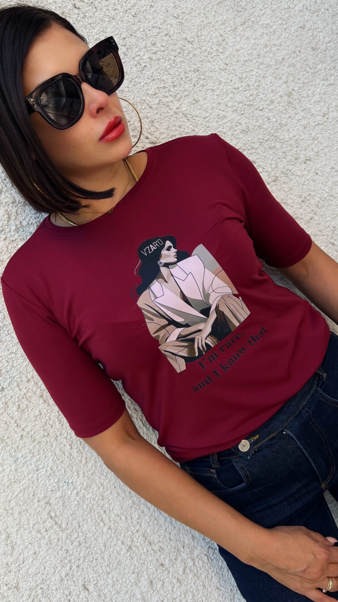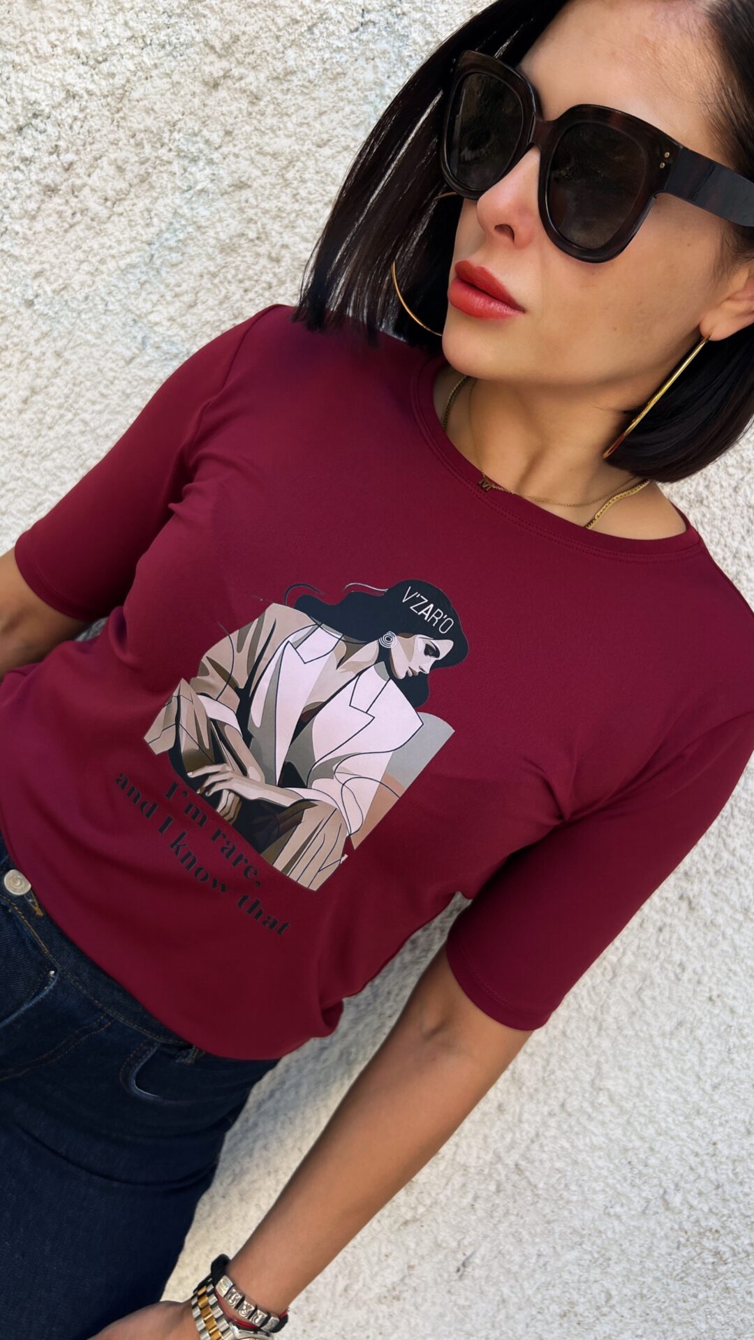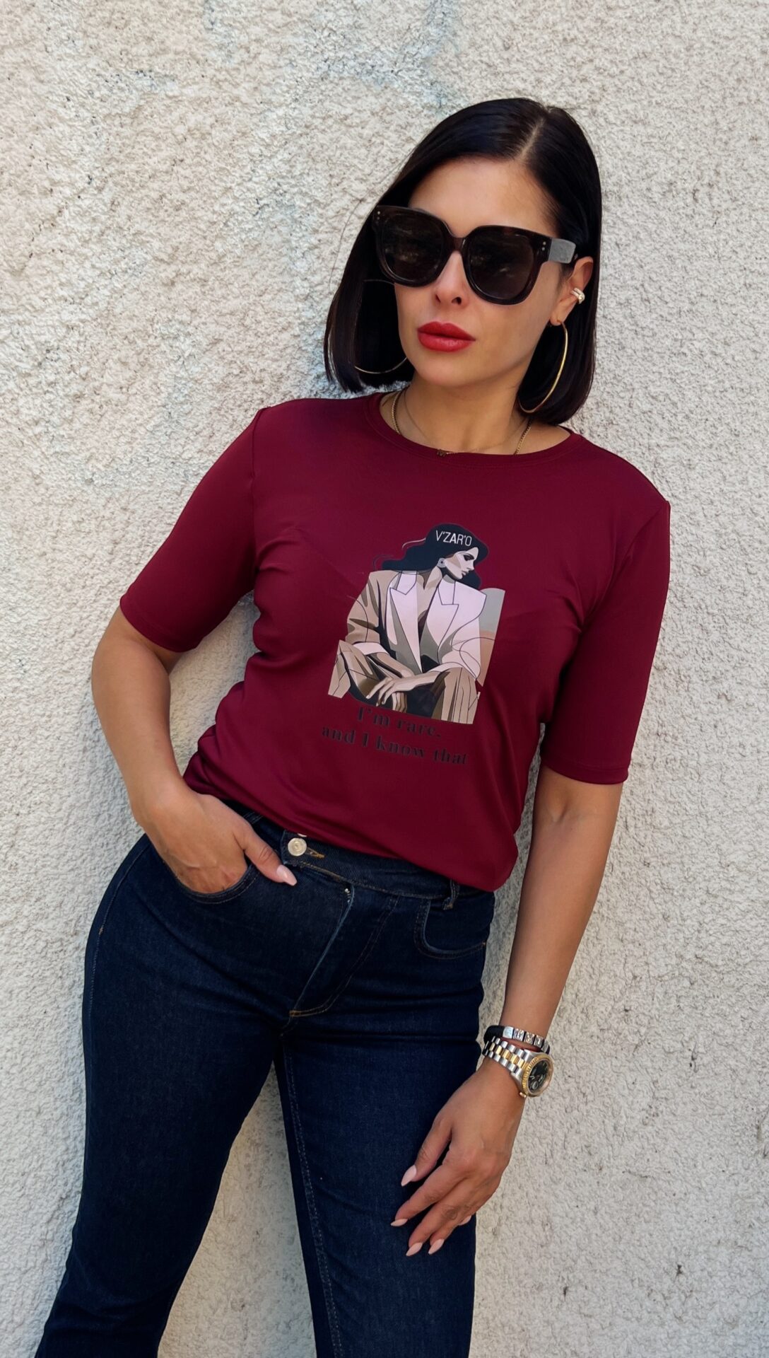 Блуза с къс ръкав в  бордо цвят и щампа.