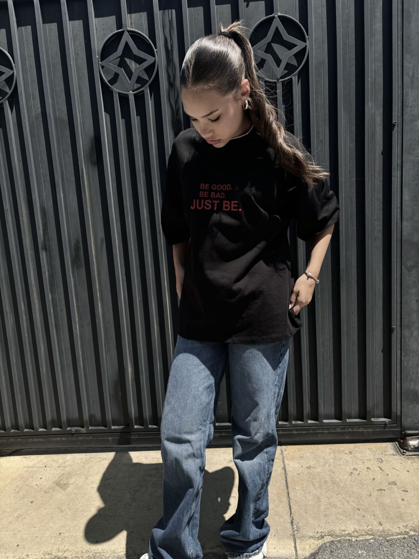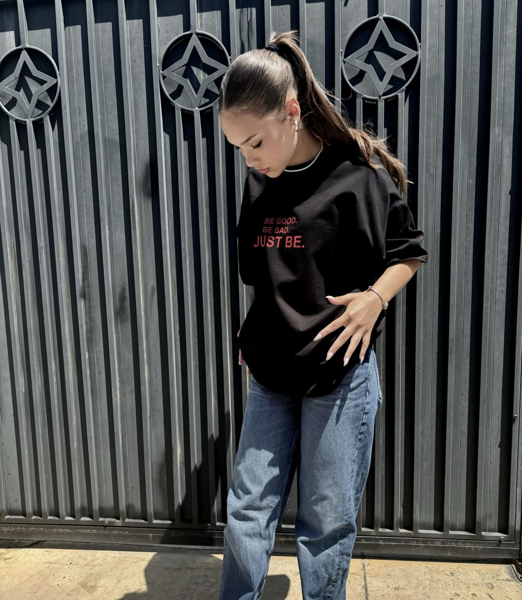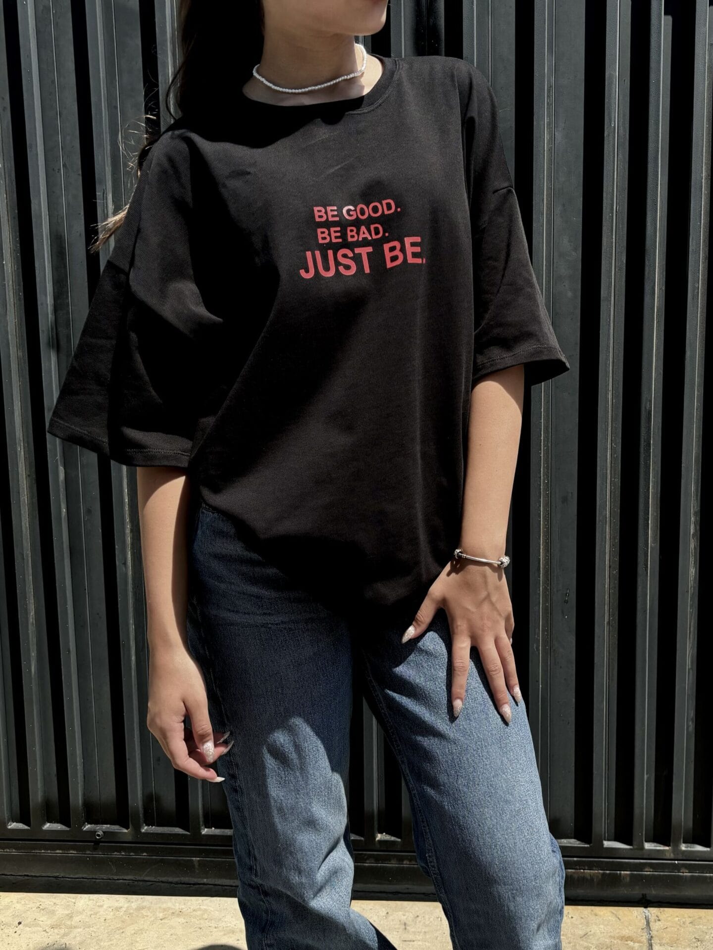 Дамска черна тениска с щампа. Широк, уголемен модел.