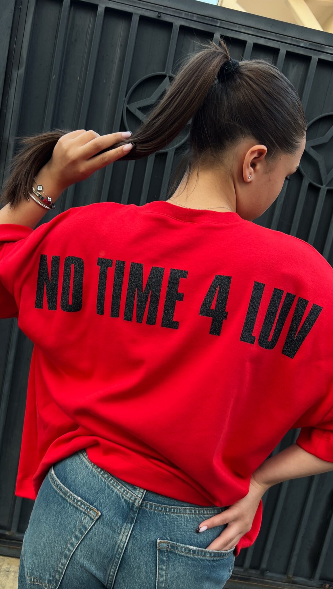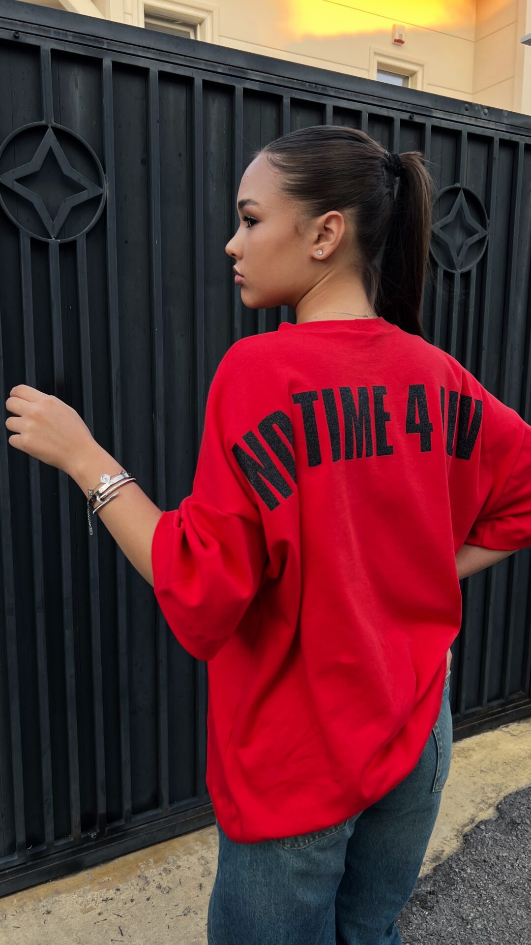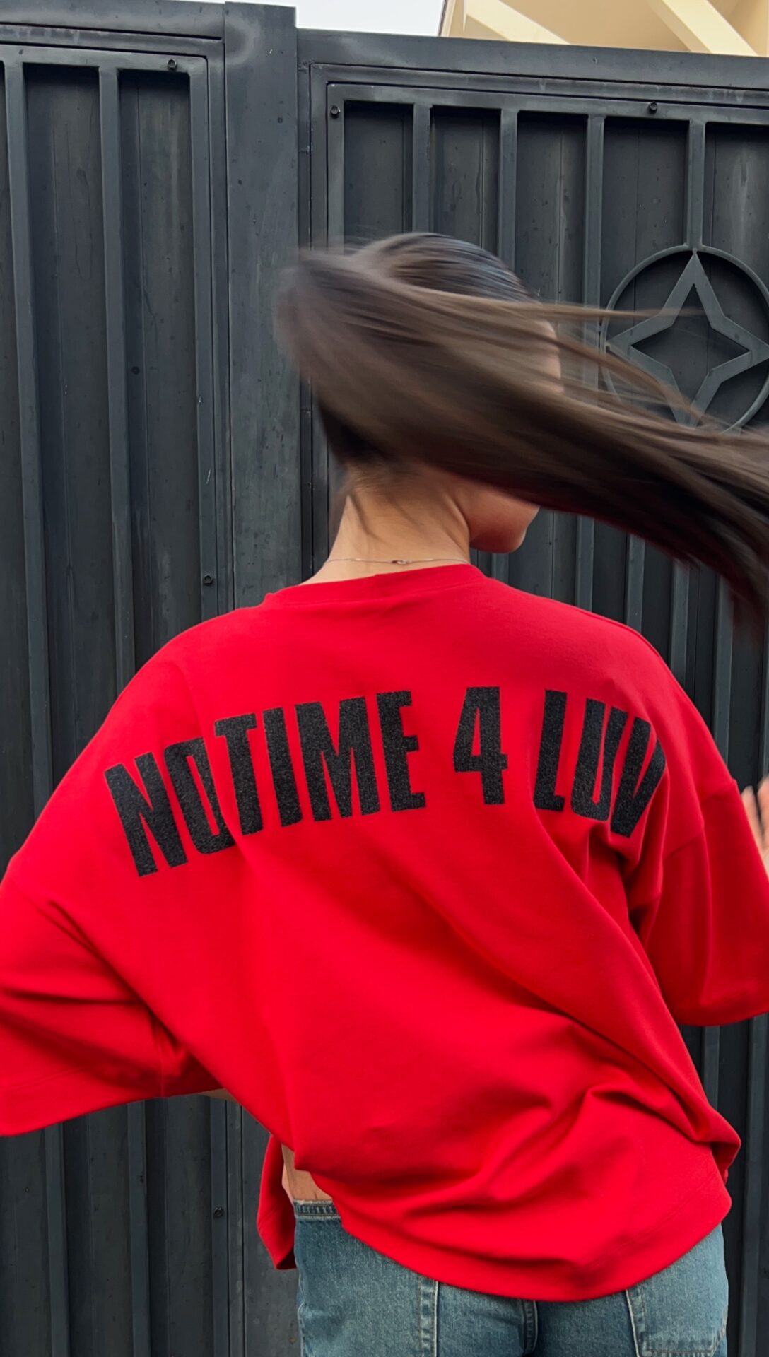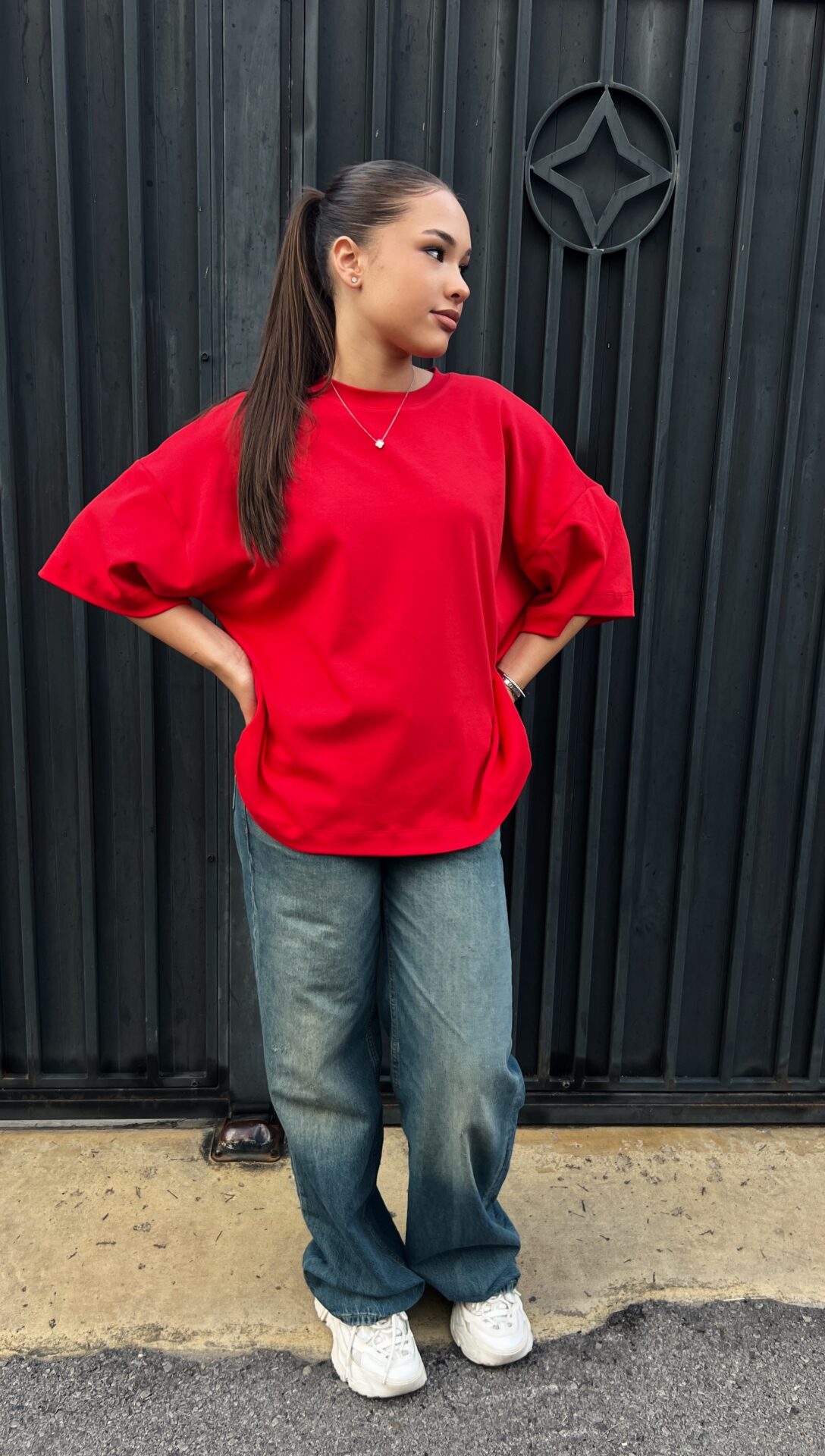 Дамска червена тениска с щампа – надпис с блестящ ефект. Широк, уголемен модел.