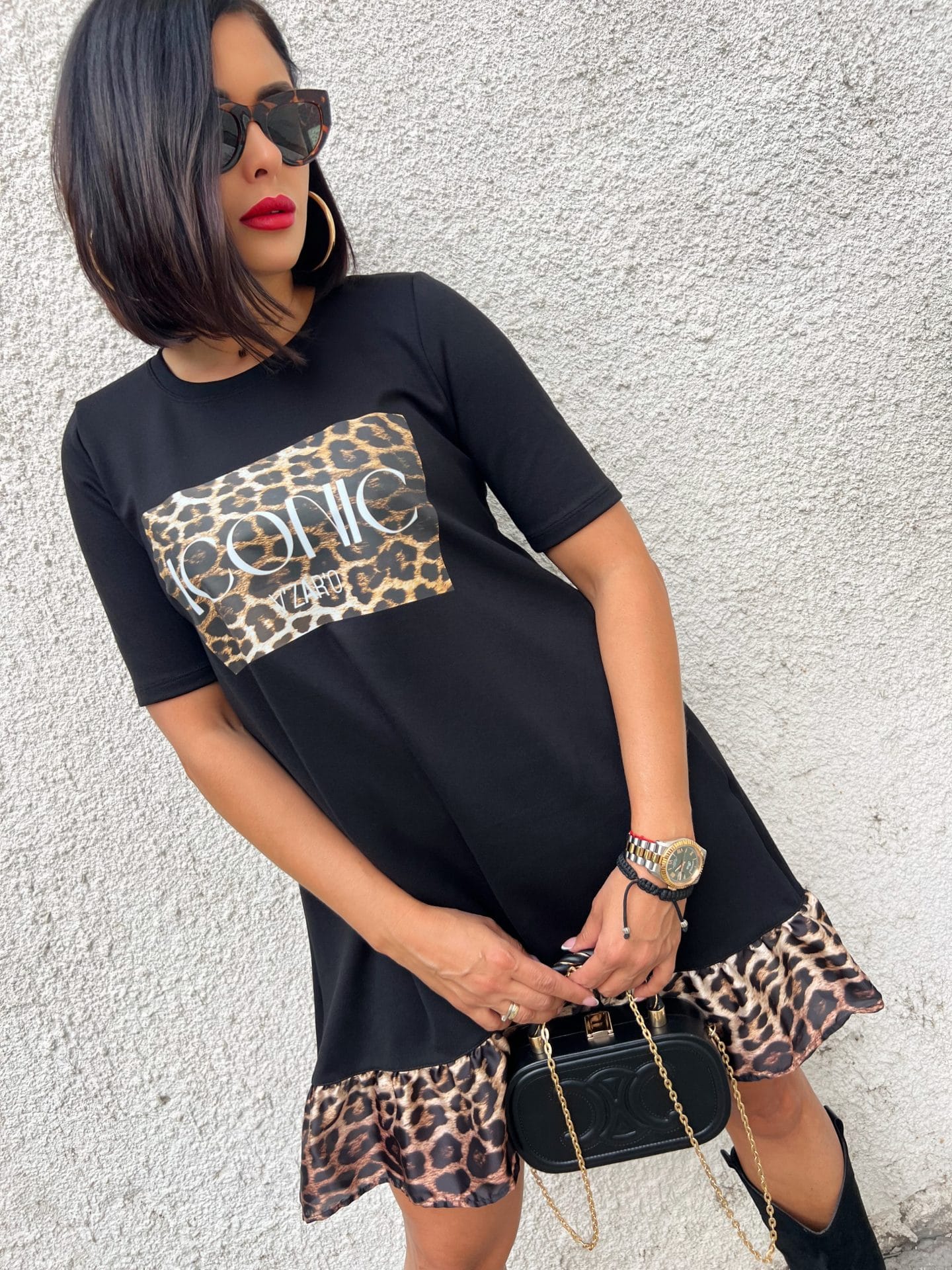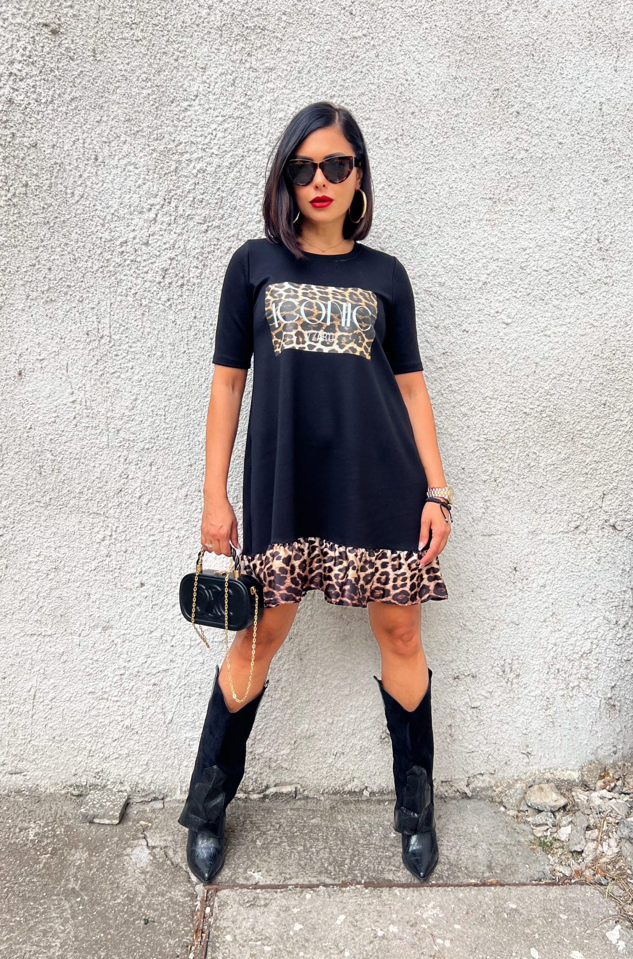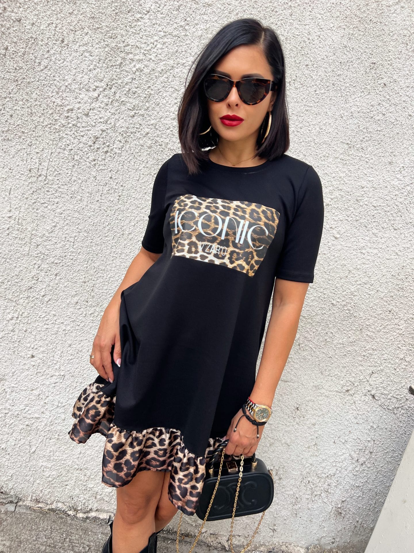 Рокля в черен цвят, къс ръкав, леопардова къдричка в долната част и щампа.