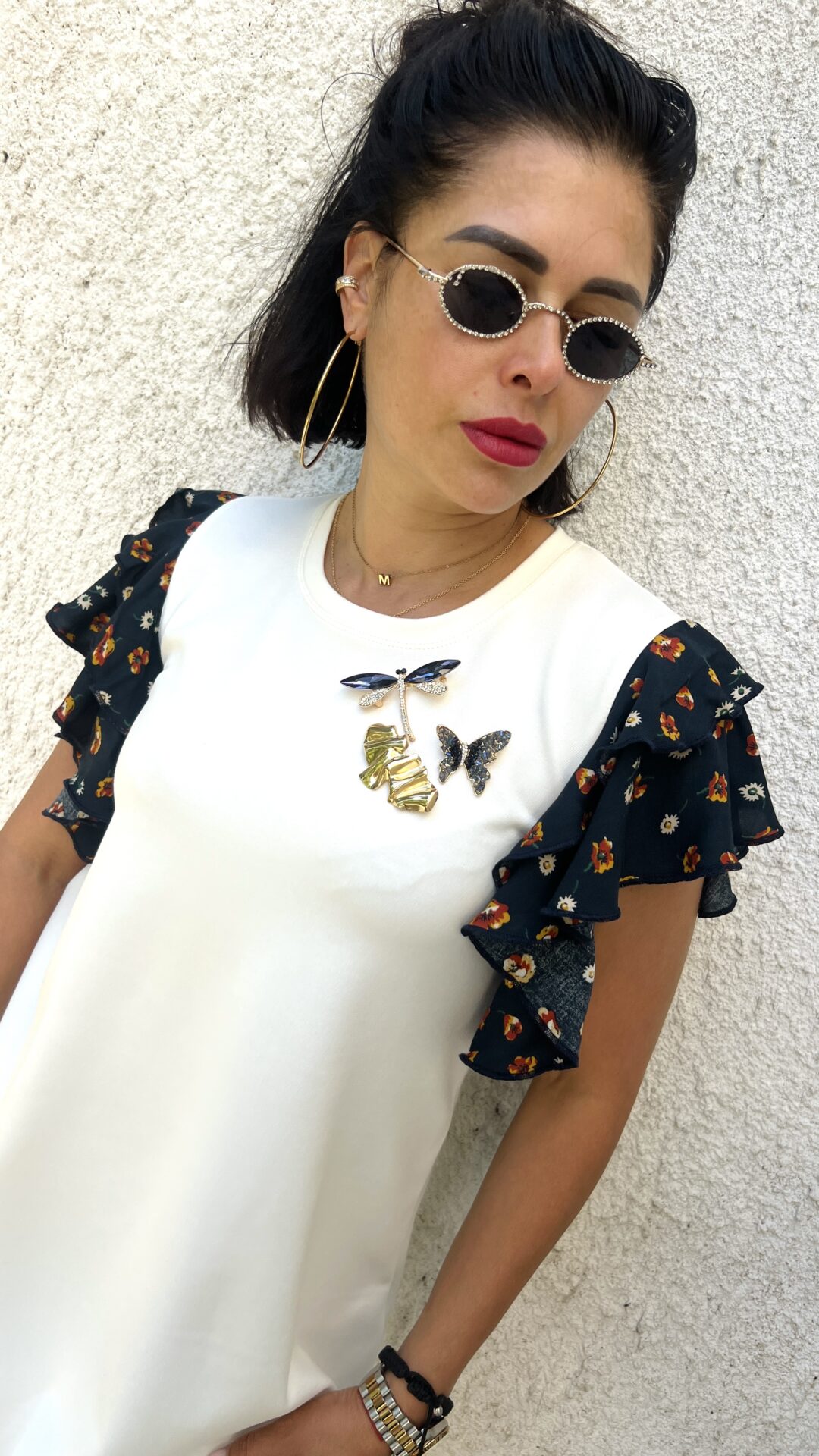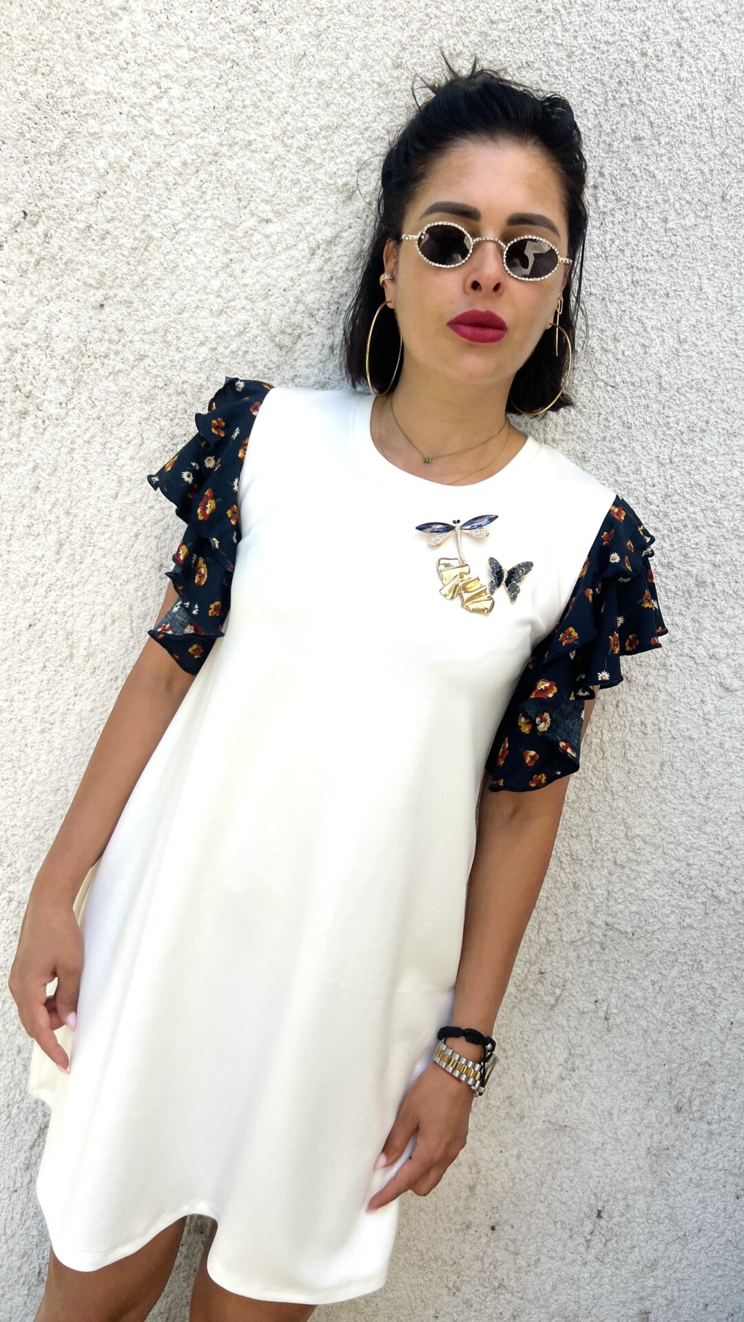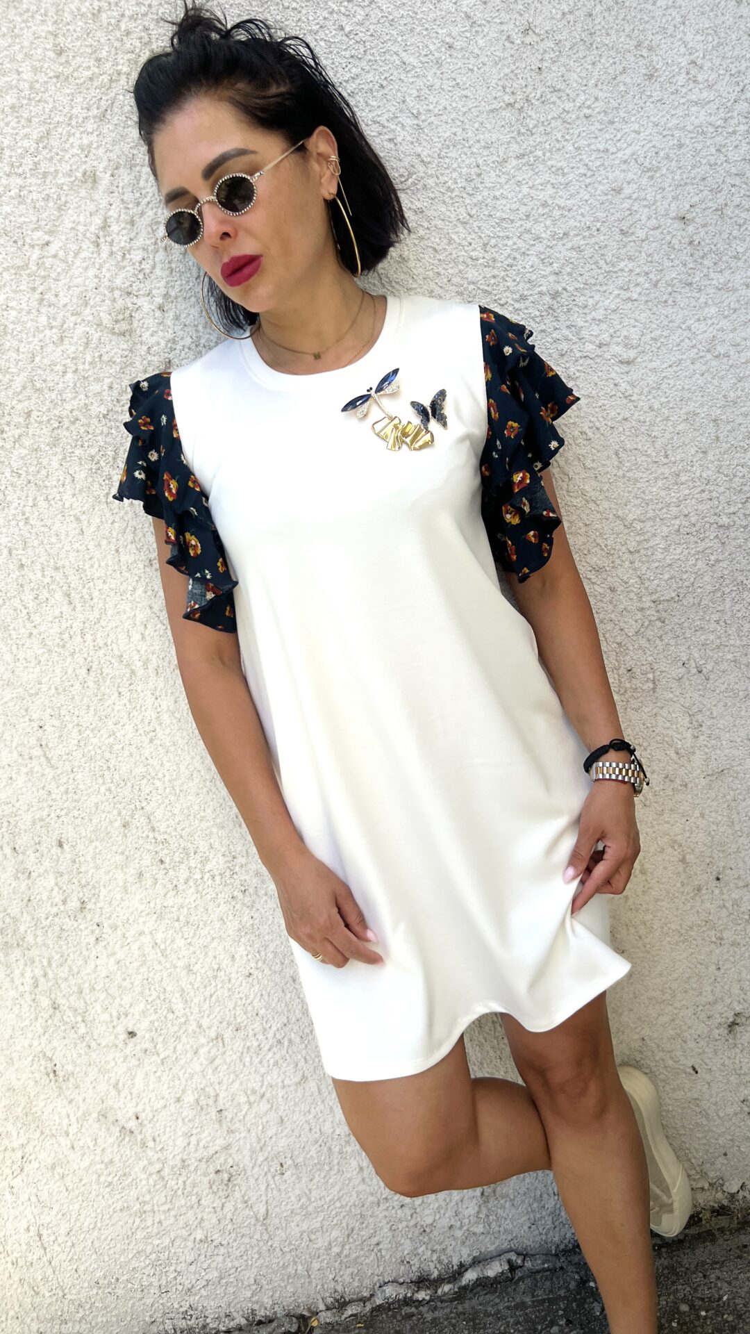 Къса рокля в цвят екрю, свободен модел, ефектни флорални ръкави.