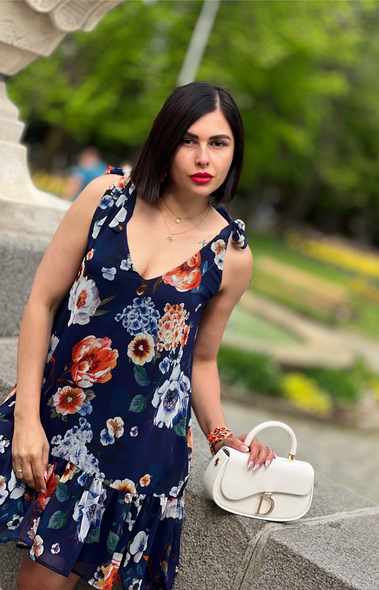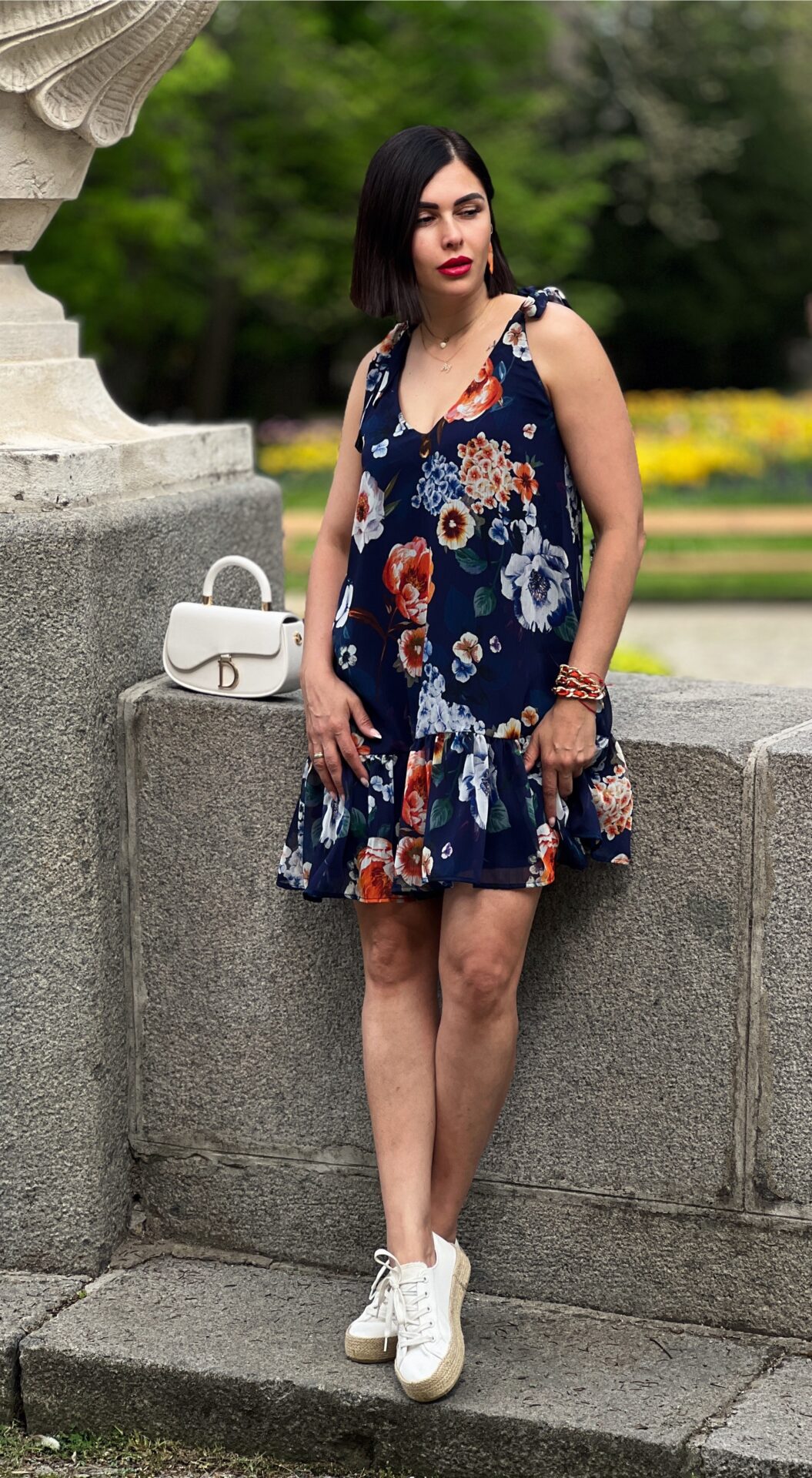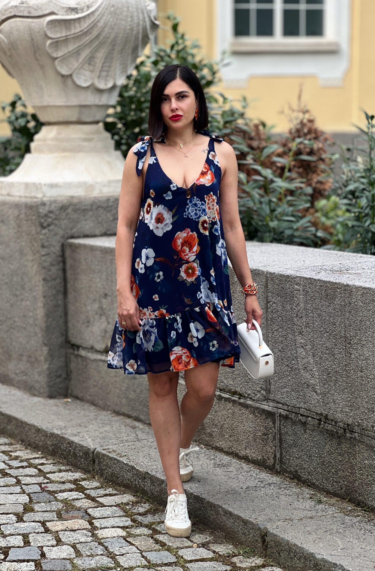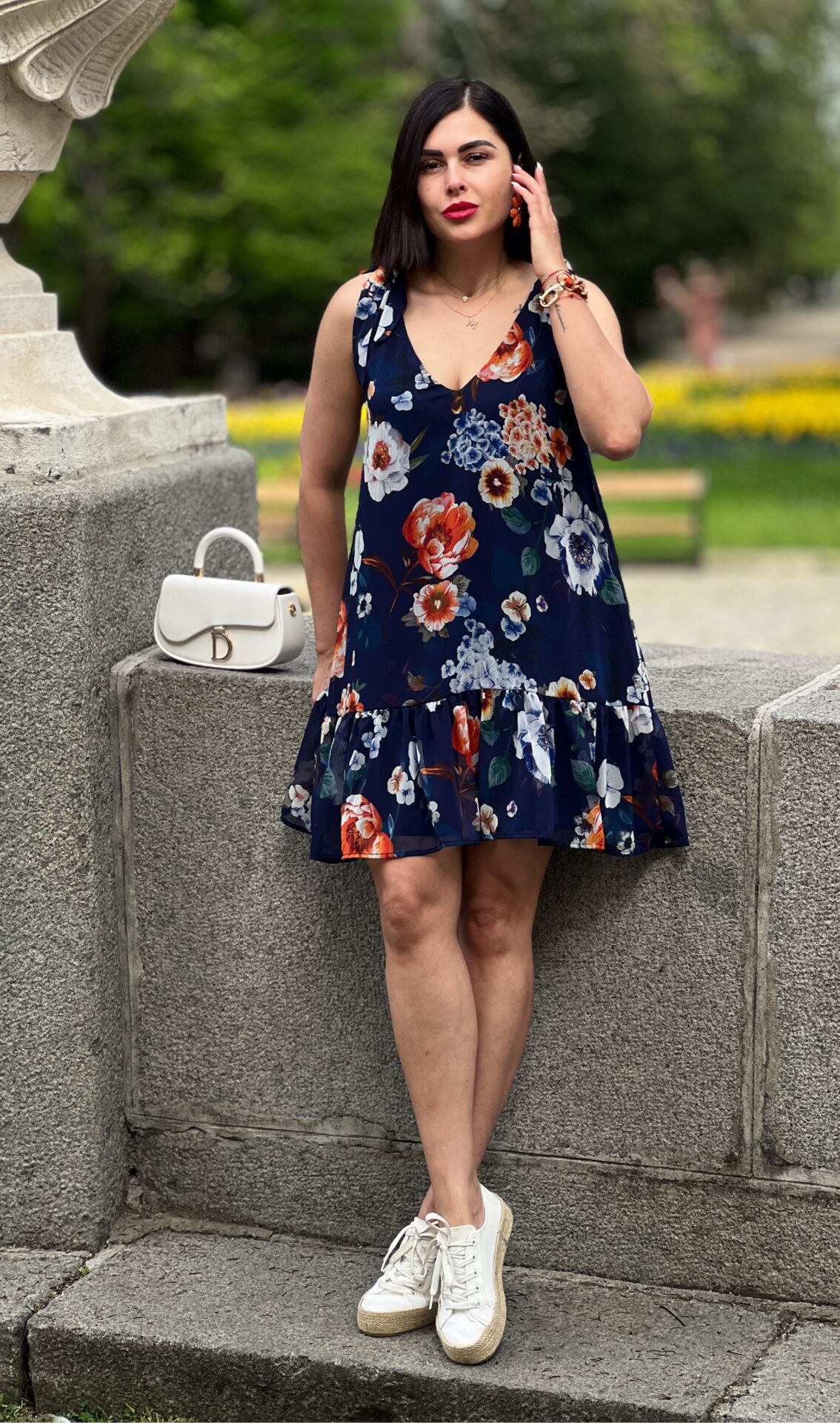 Къса ефирна рокля във флорален десен, свободен, модел, презрамки, които се връзват.