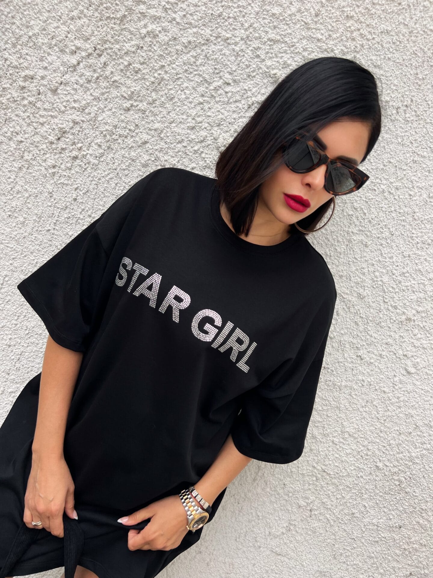 Рокля в черен цвят, къс ръкав, апликация – надпис от камъни.. Широк, уголемен модел.