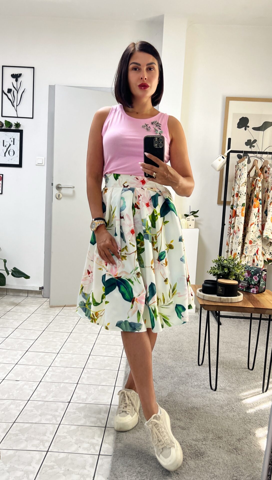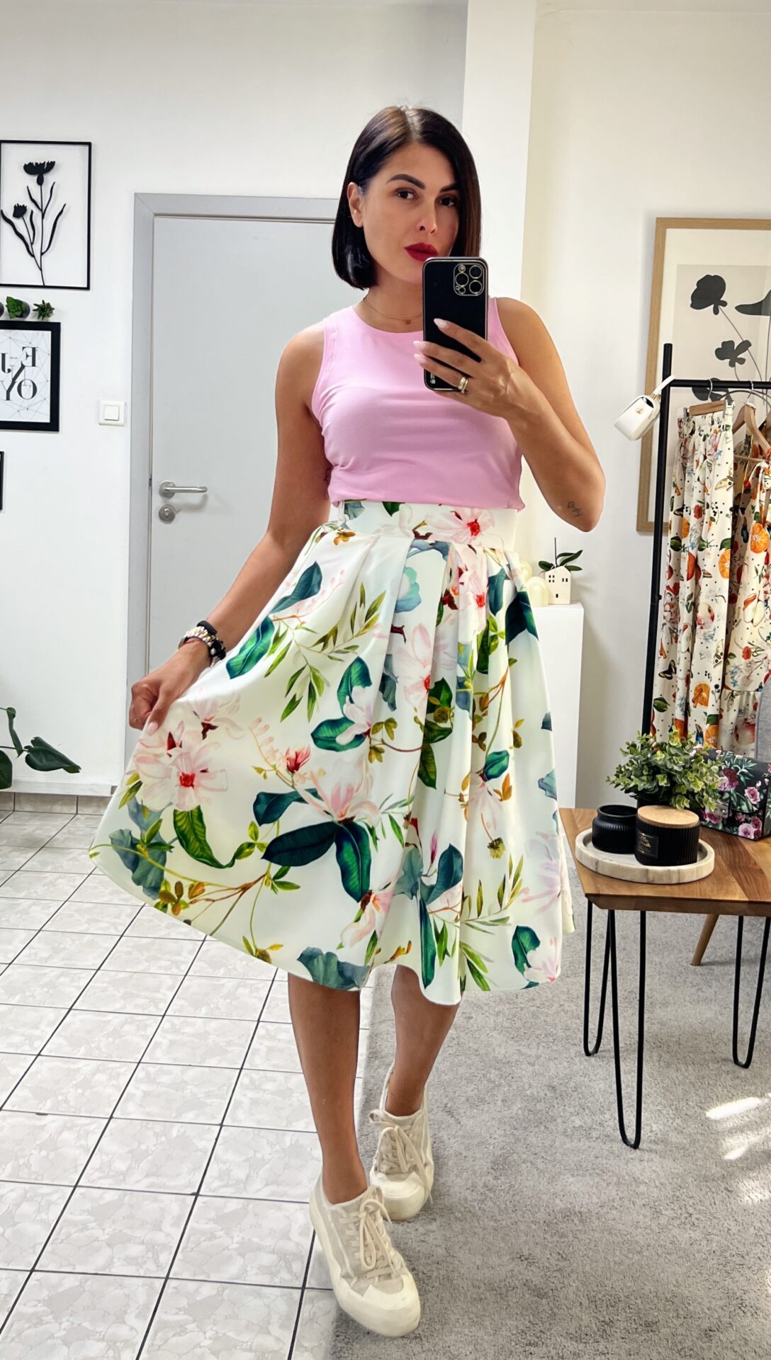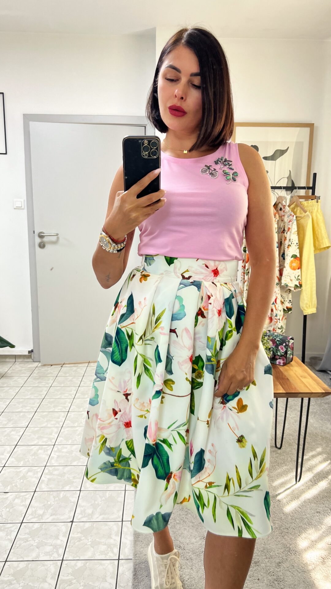 Пола, миди дължина с висока талия във флорален десен. Закопчава се с цип.