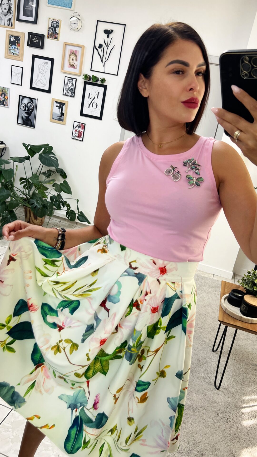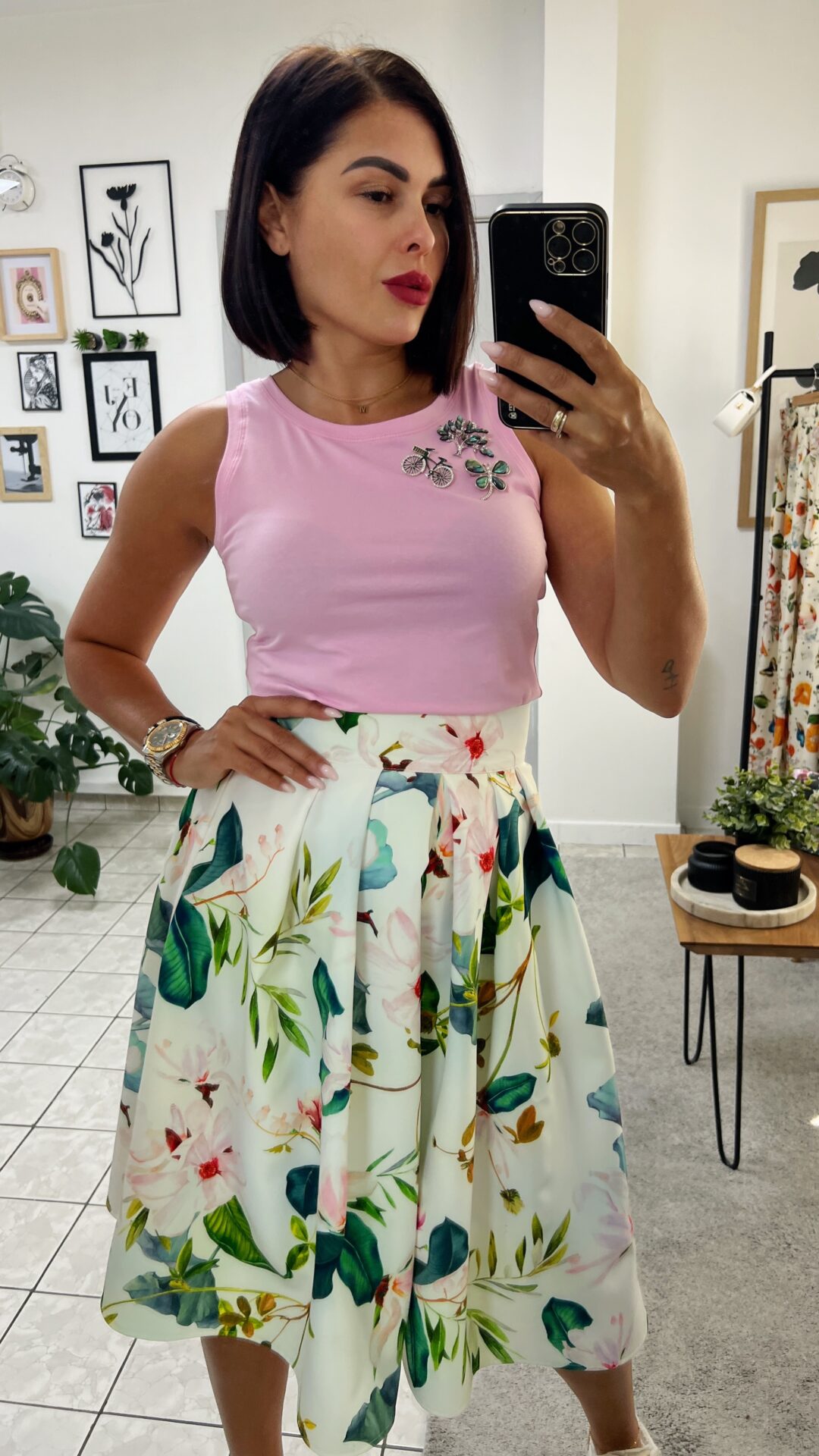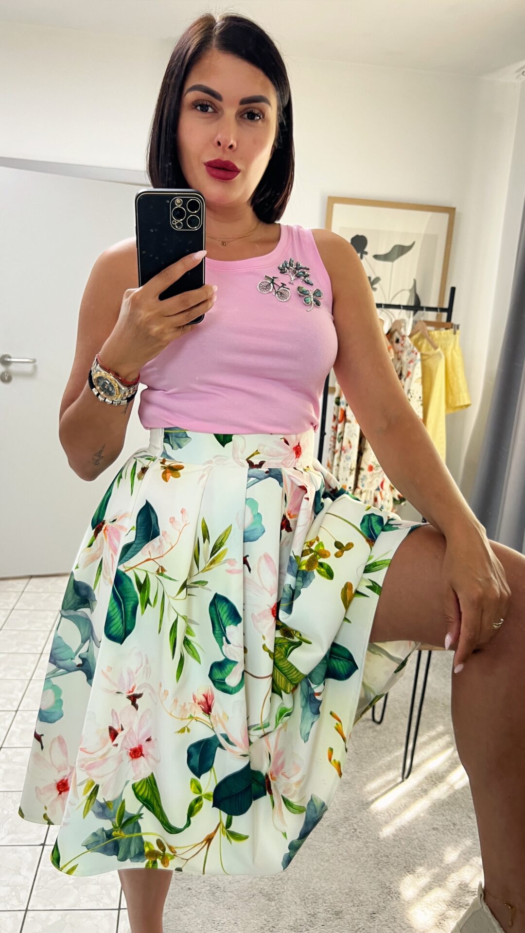 Пола, миди дължина с висока талия във флорален десен. Закопчава се с цип.