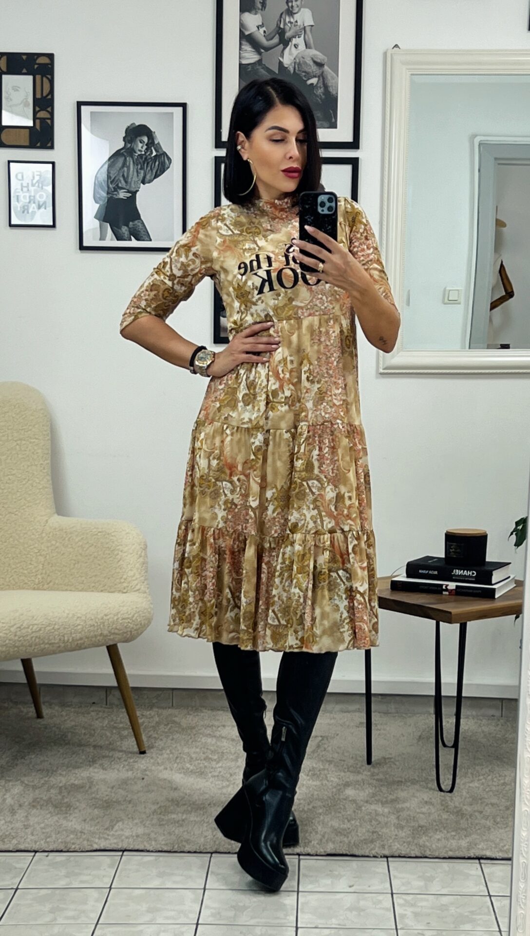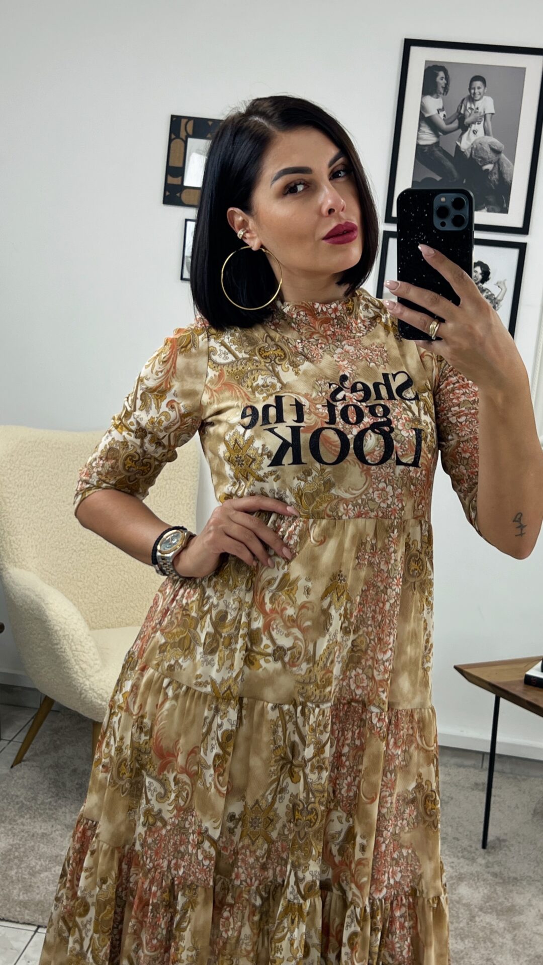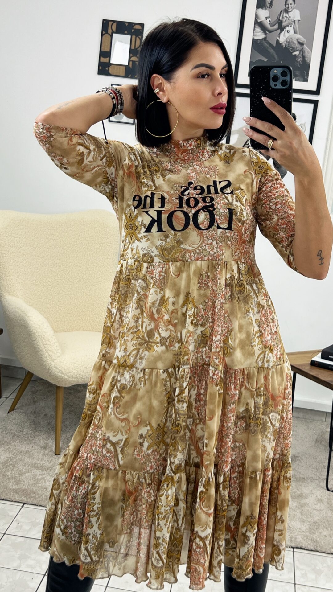 Миди еластична рокля с 3/4 ръкав в приятен цветен десен с надпис – щампа.