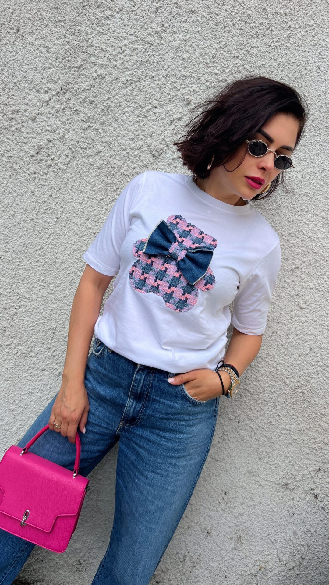 Бяла тениска с къс ръкав, декорирана с мече и подвижна брошка – панделка, която се сваля.