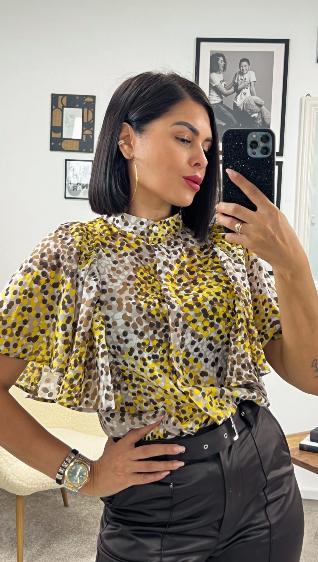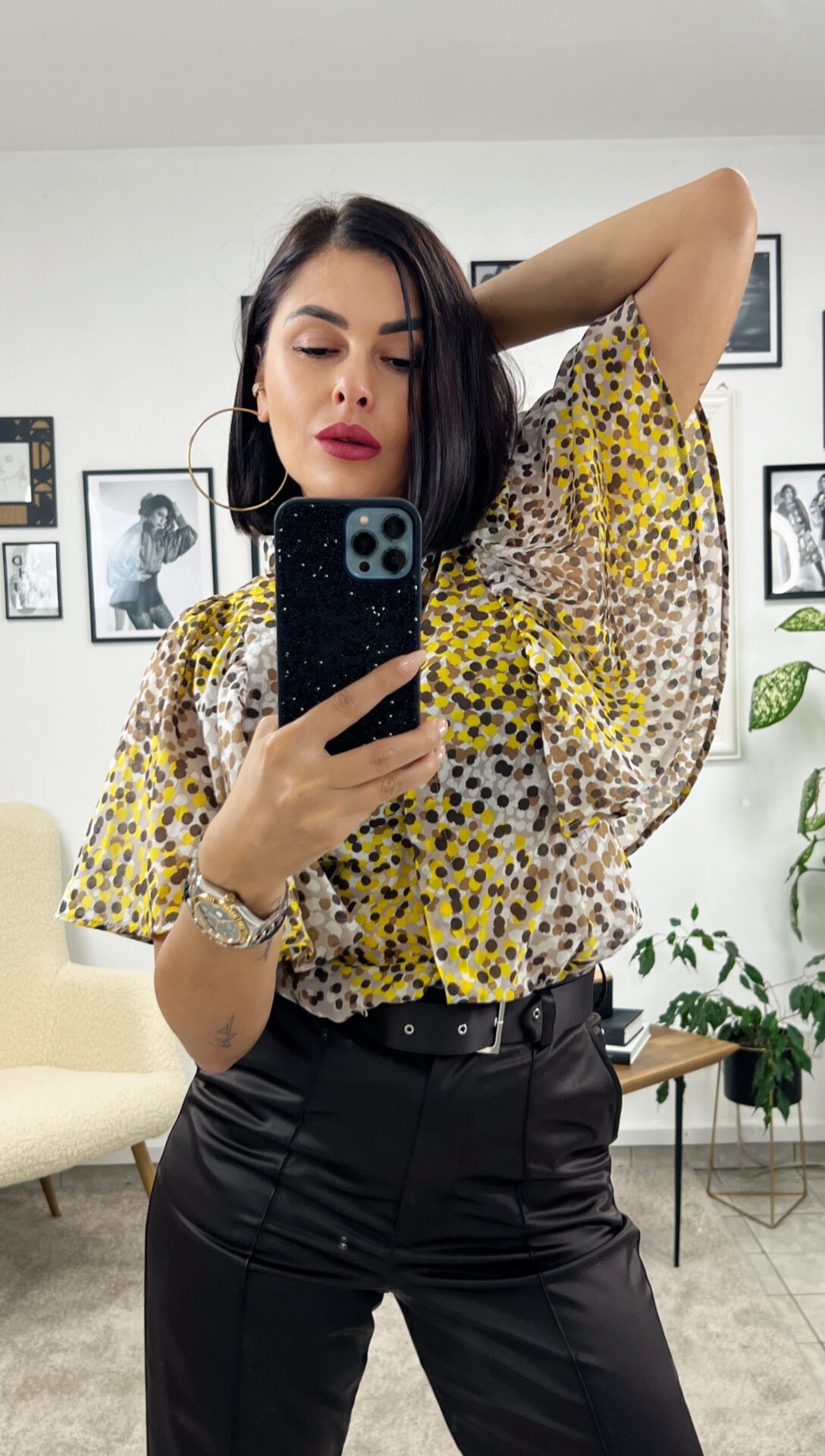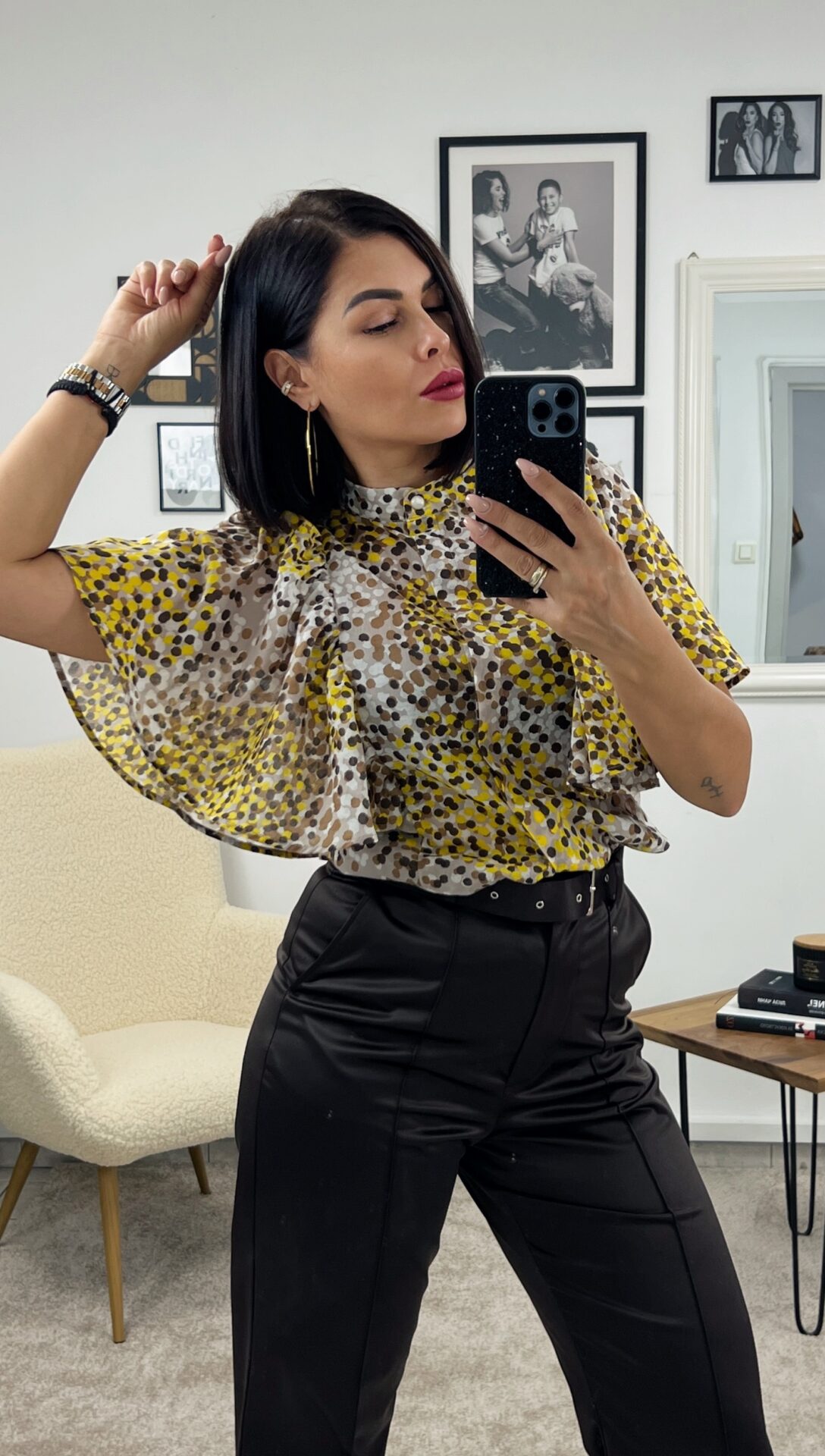 Стилна риза с ефектни ръкави, закопчава се с копчета, модел по тялото.
