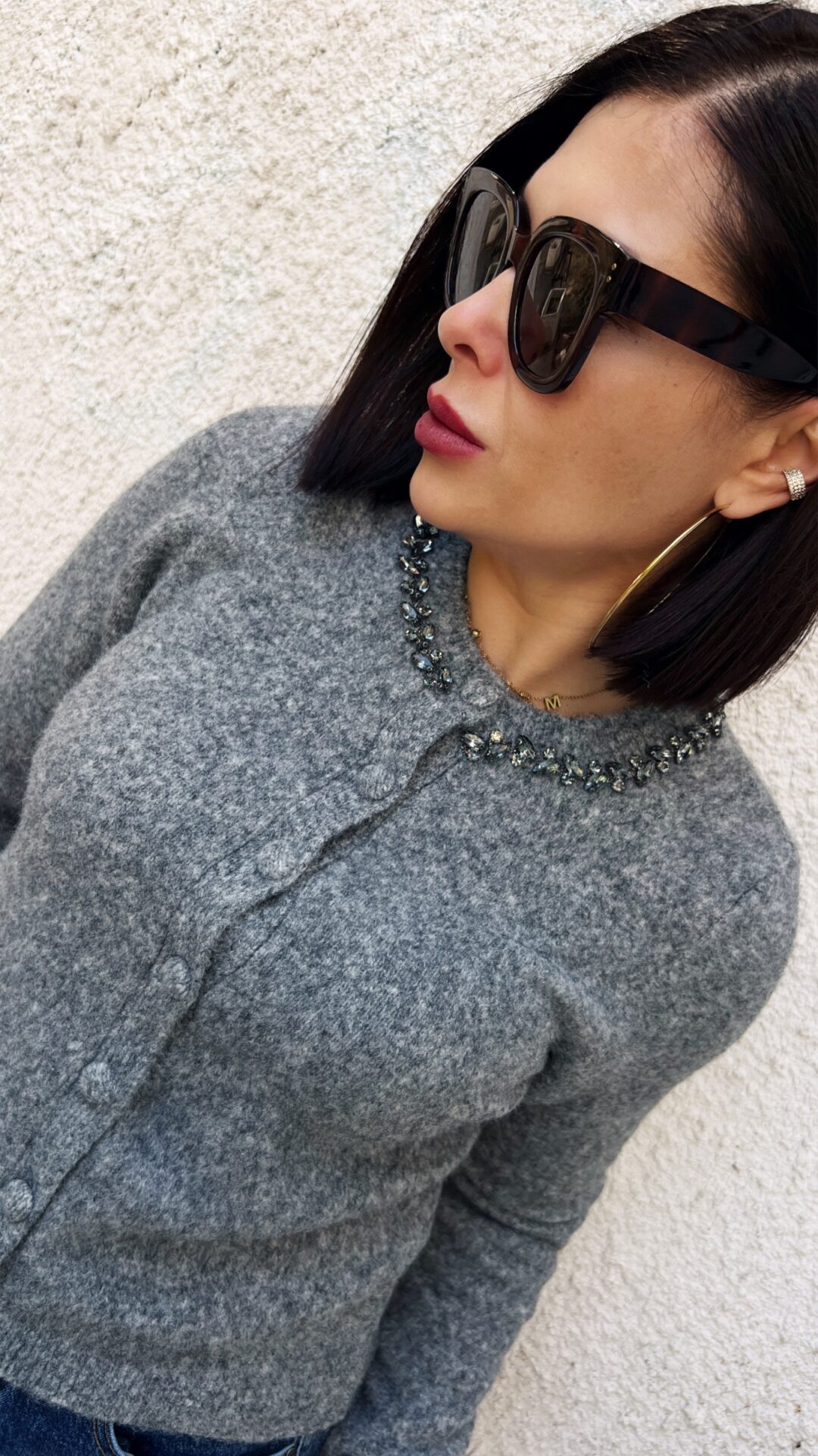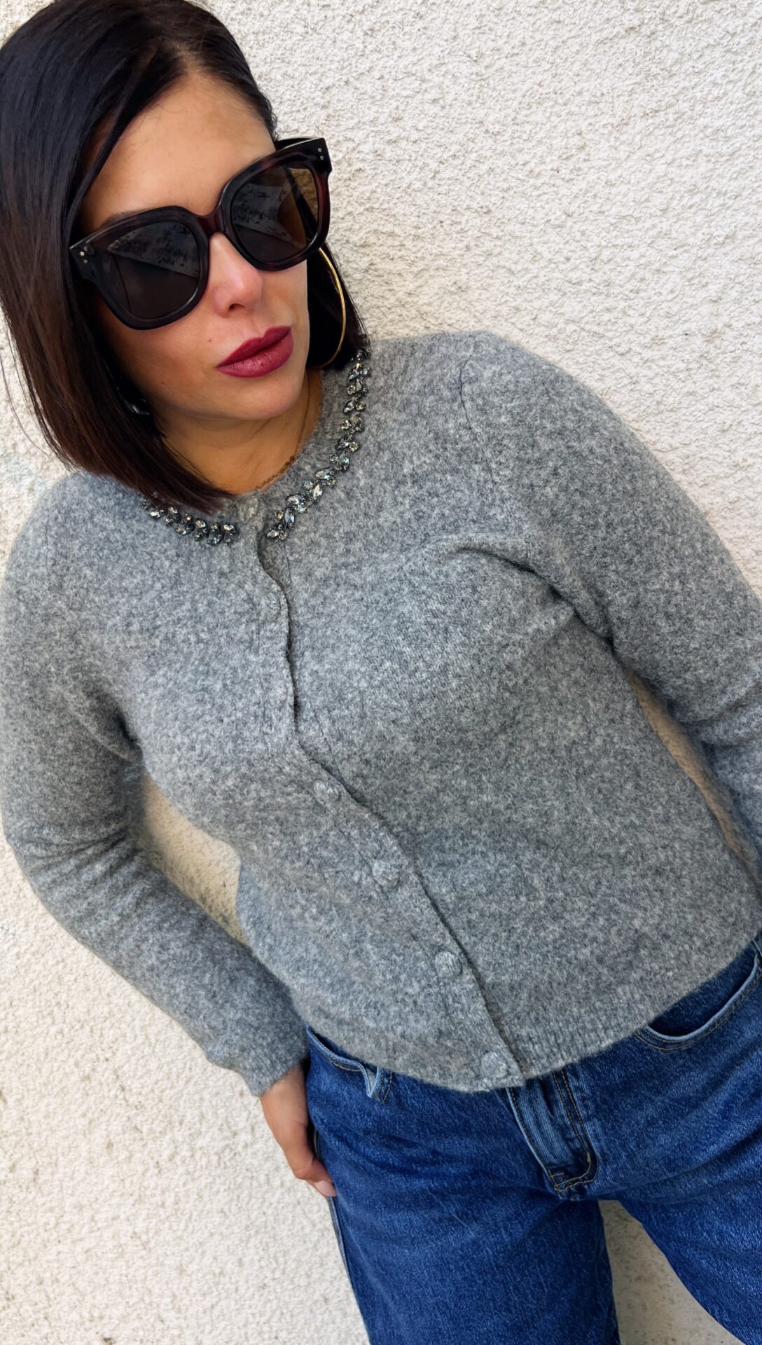 Мека жилетка в сив цвят и красиви камъни около деколтето. Универсален размер. Дължина – 52см, Гръдна обиколка едностранно – 44см