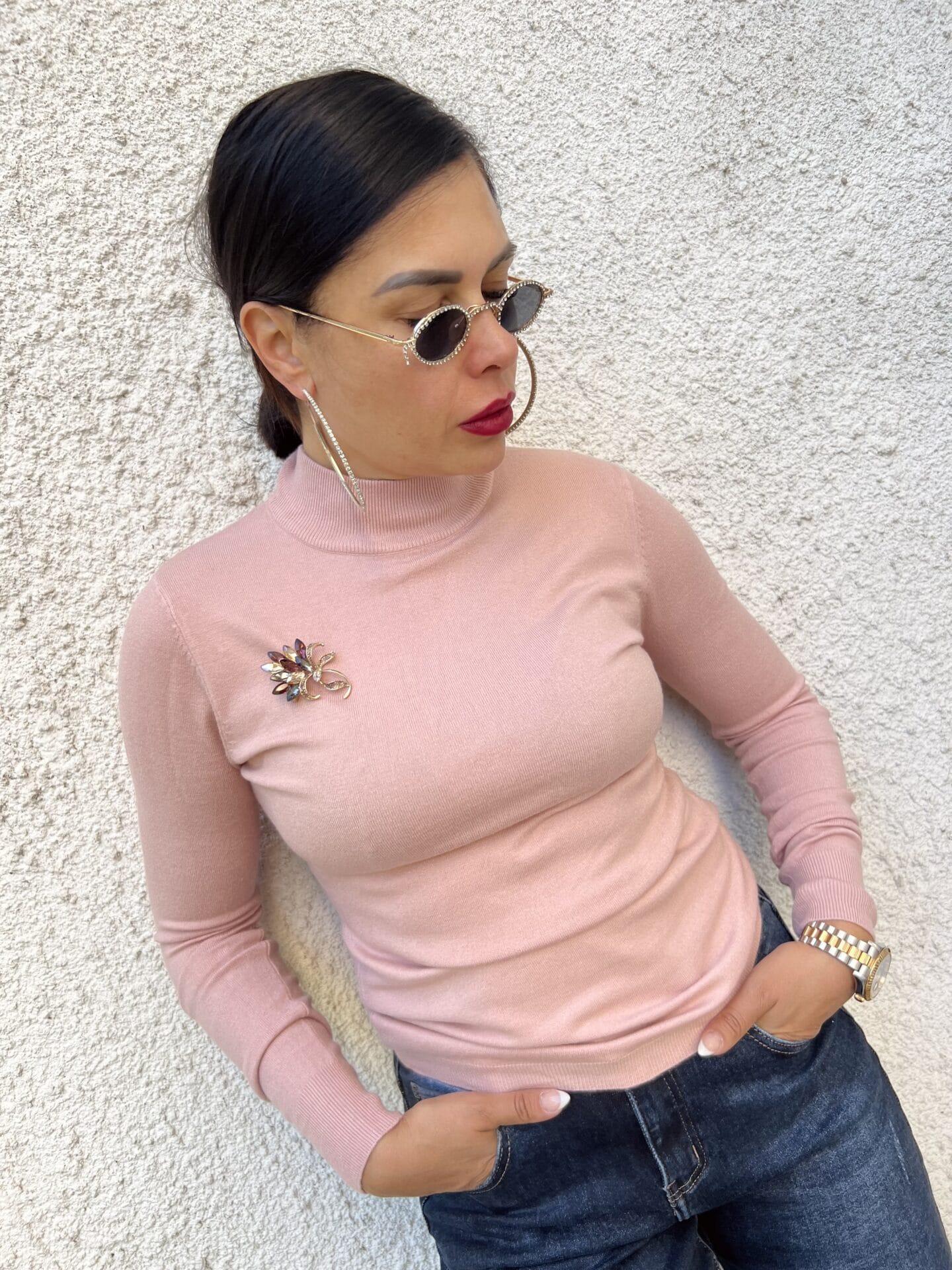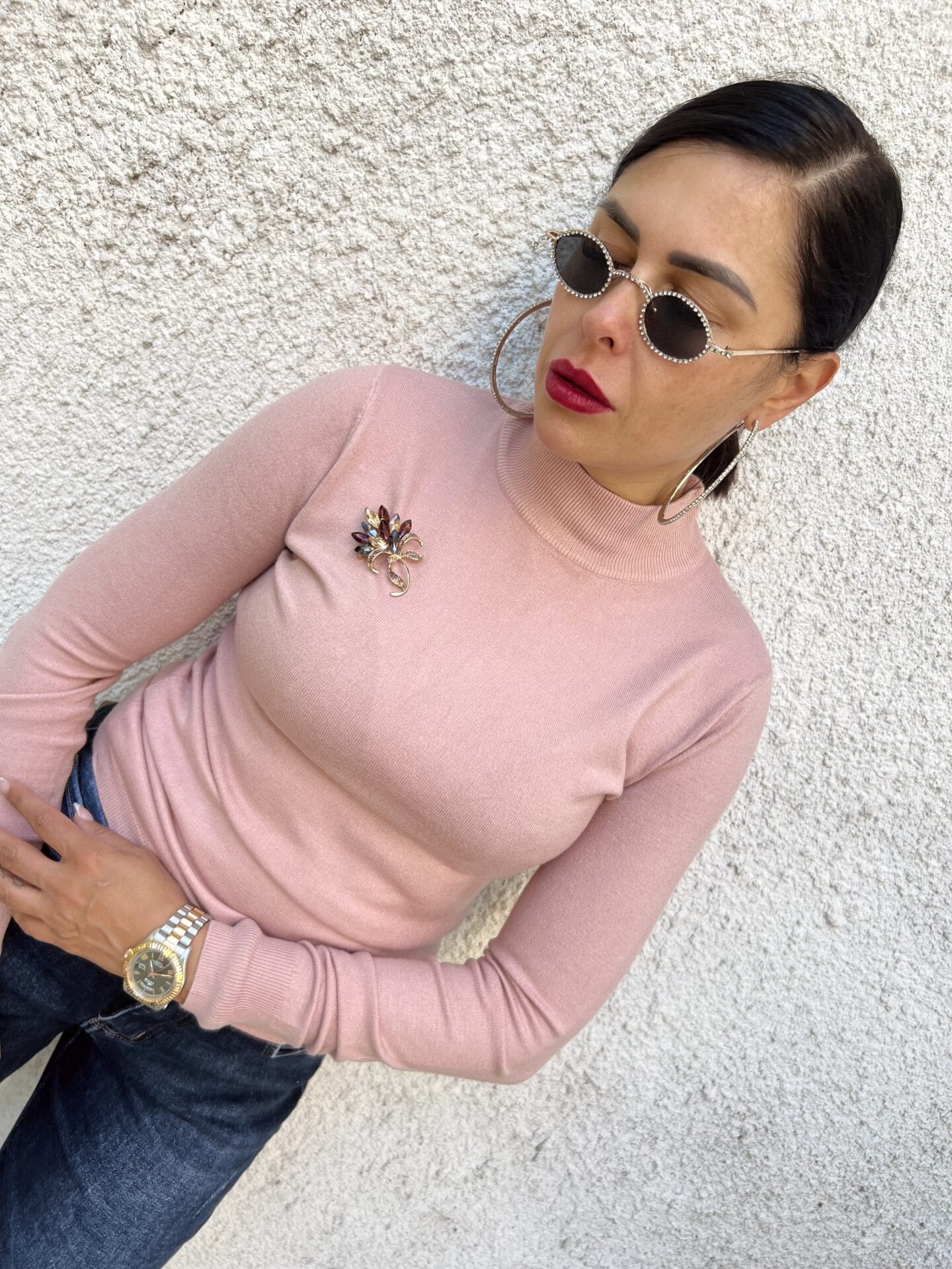 Тънък пуловер в пудрено розов цвят, полуполо. Универсален размер. В цената е включена и брошка ПОДАРЪК!