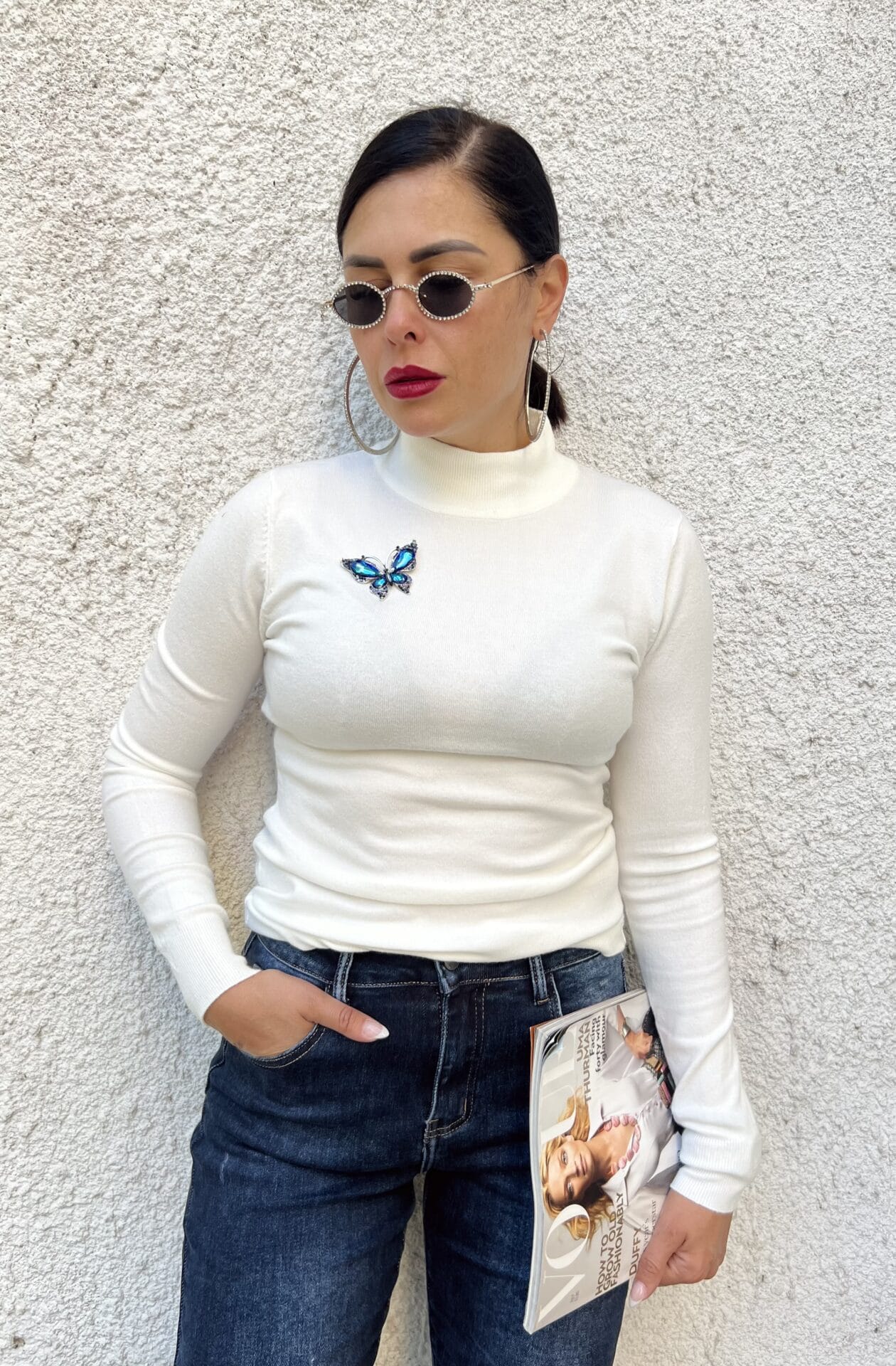 Тънък пуловер в бял цвят, полуполо. Универсален размер. В цената е включена и брошка ПОДАРЪК!