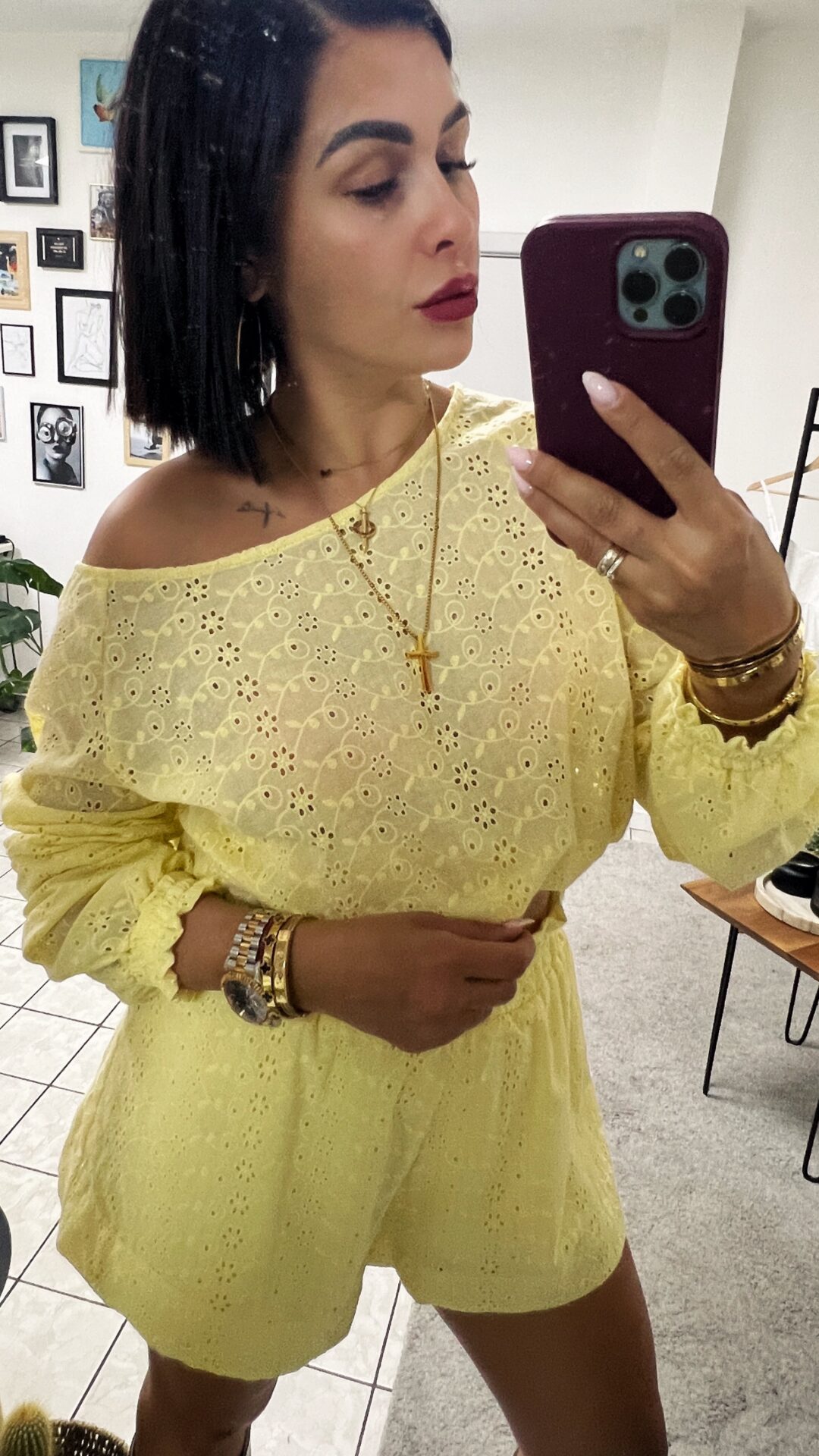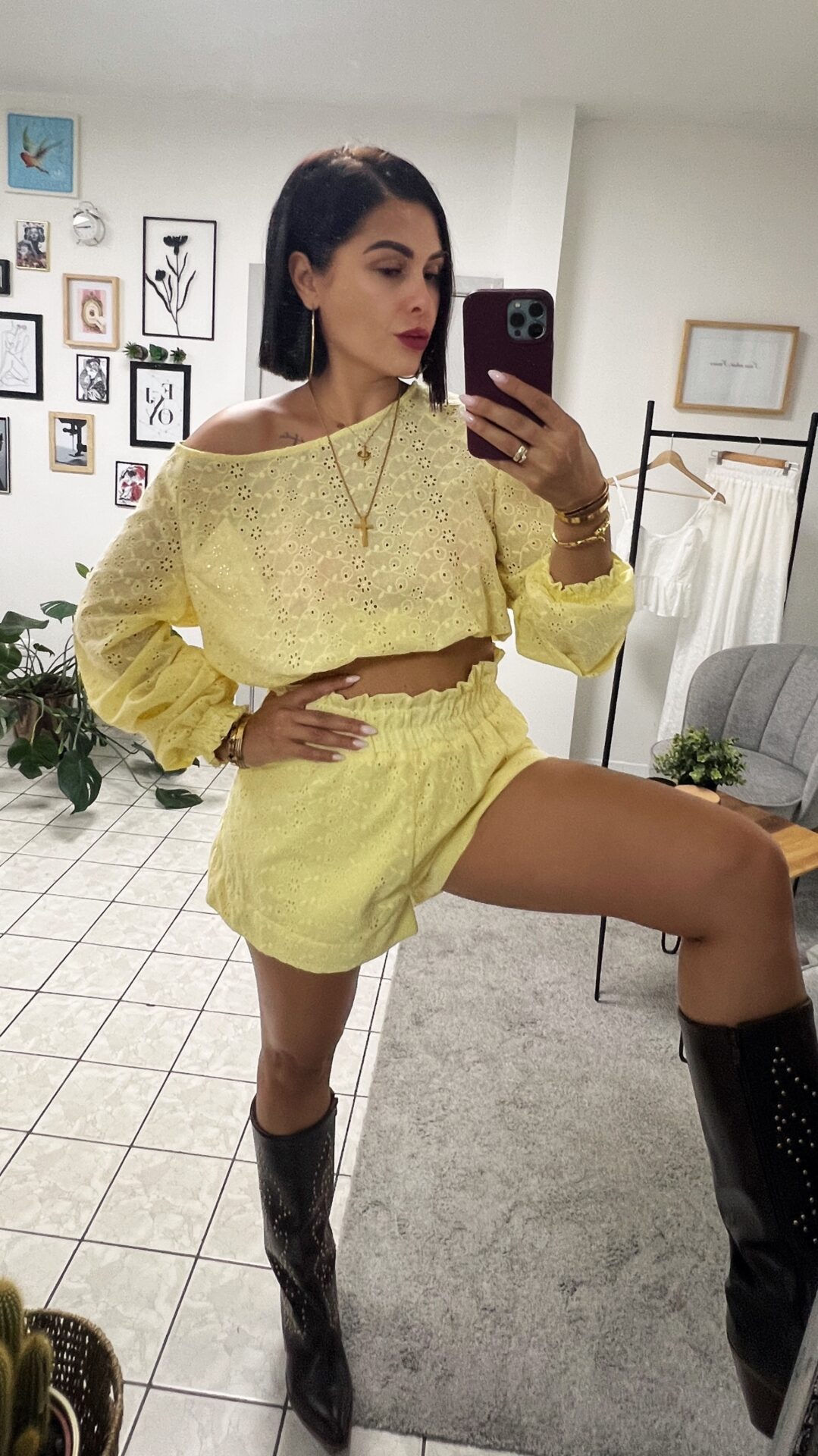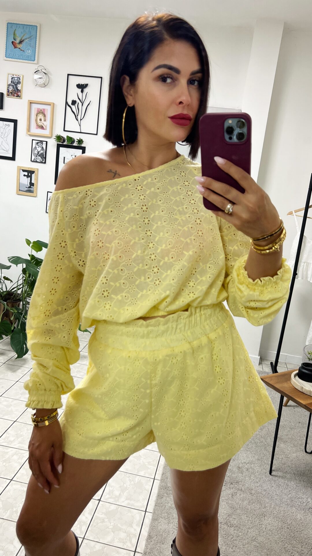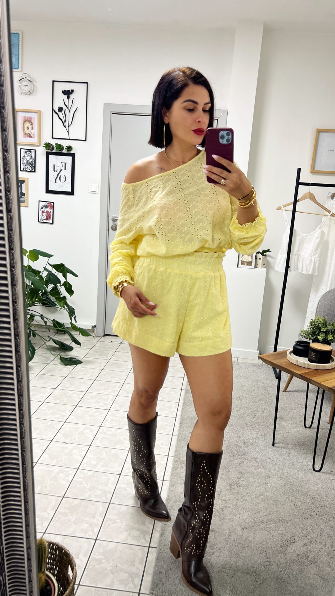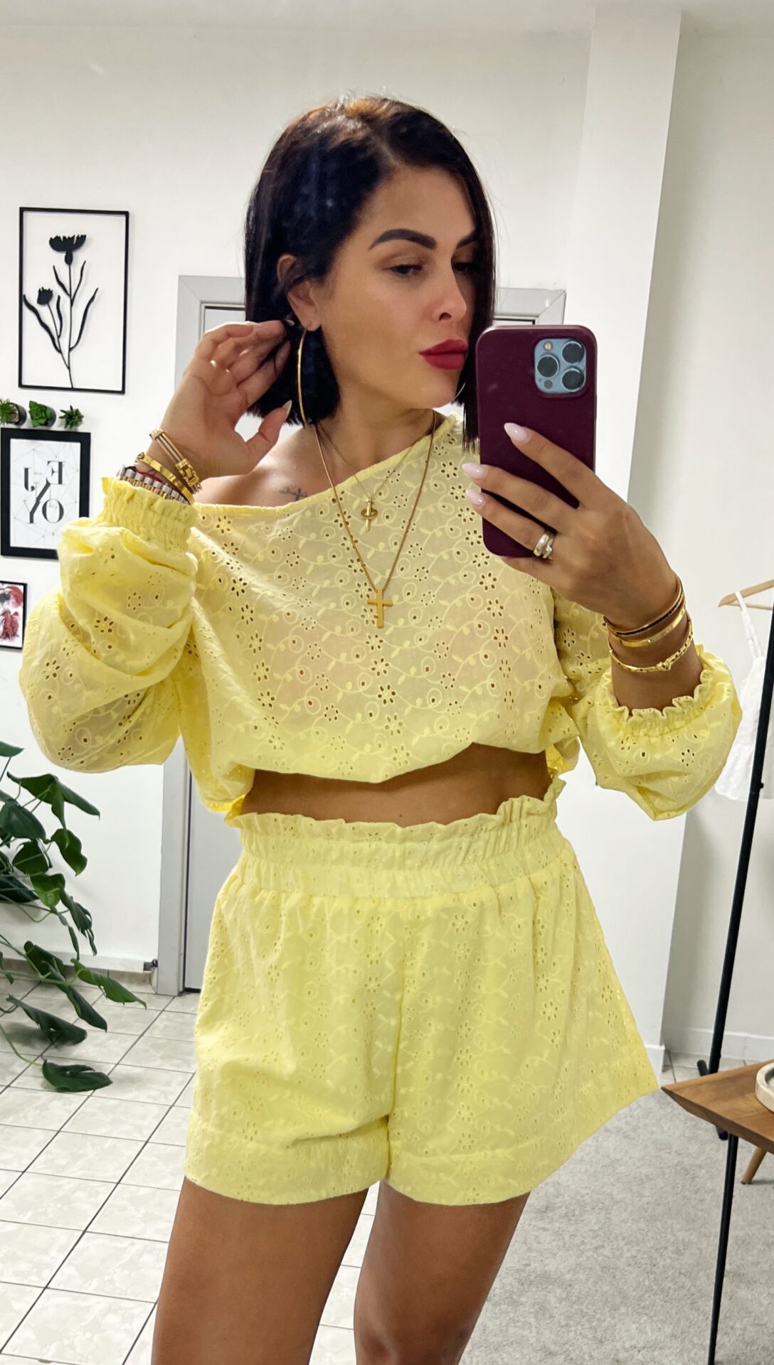 -къси панталонки, свободен модел, изработени от 100% памук (“рязана“ дантела) с ластик на талията.