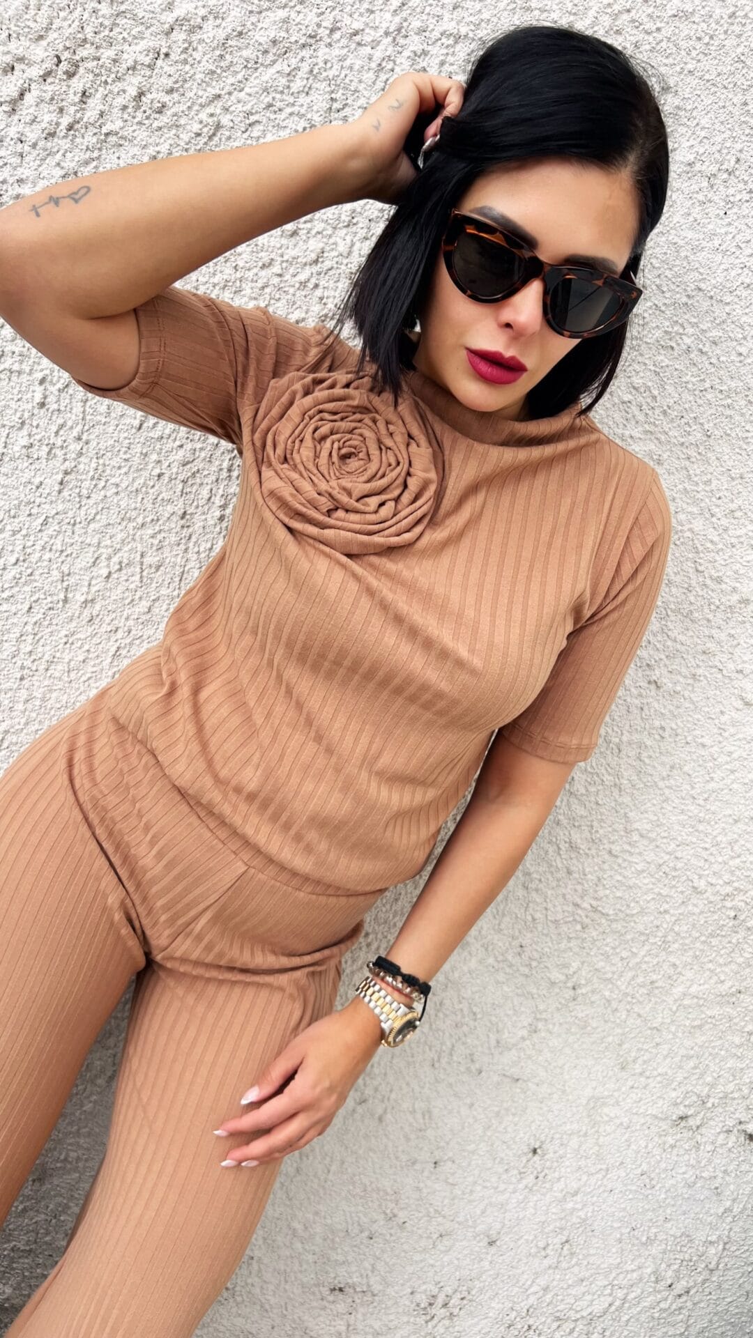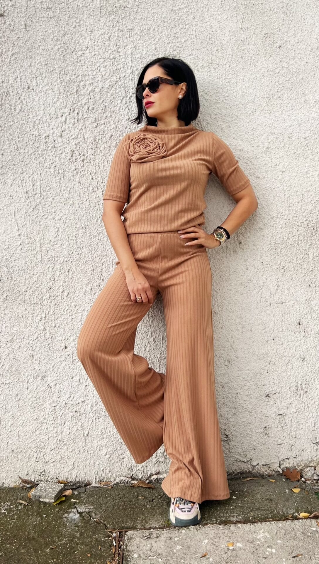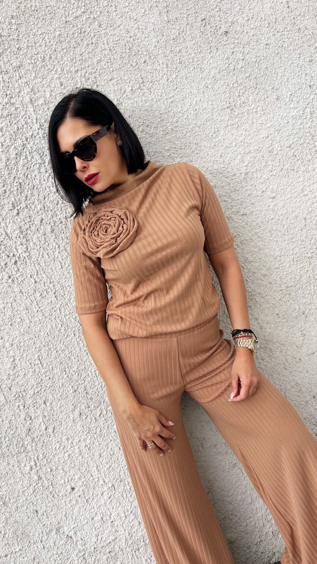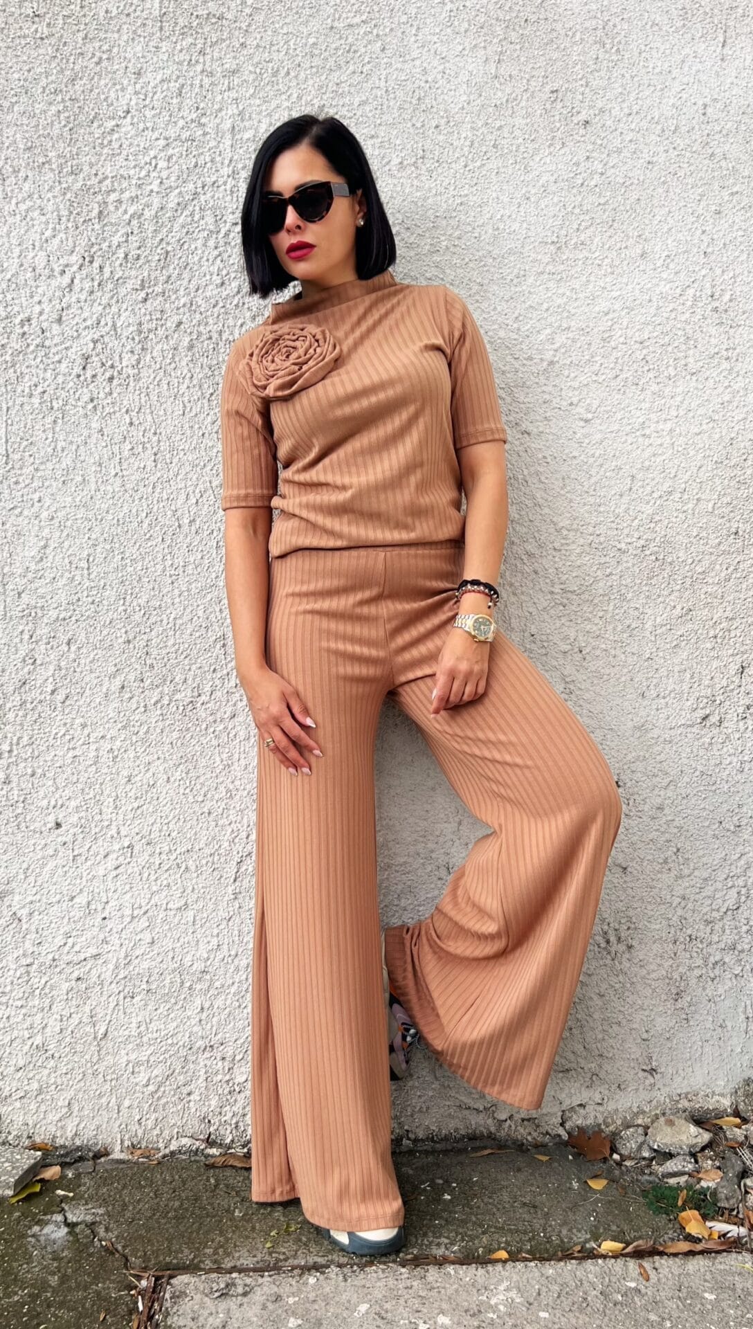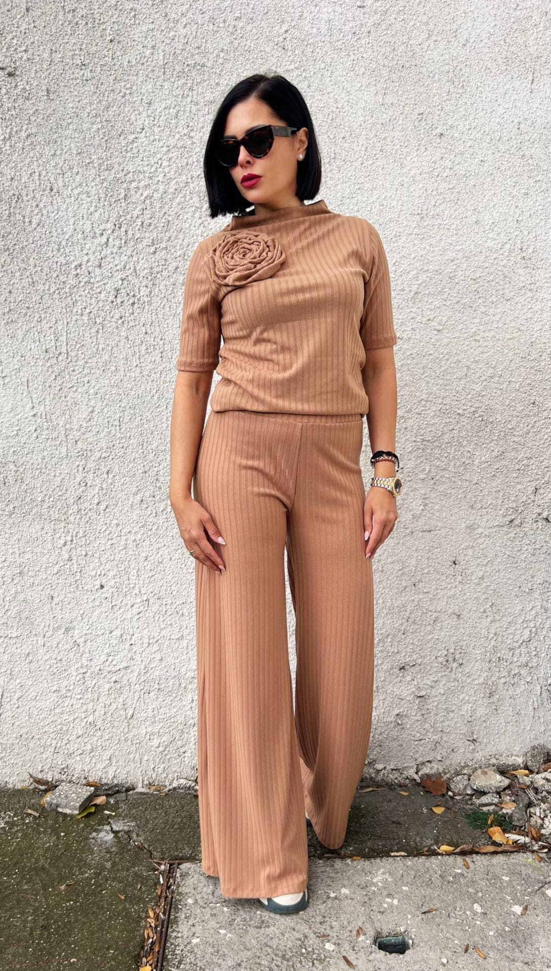 Дамски комплект – панталон и блуза в цвят карамел и ръчно изрaботено цвете.