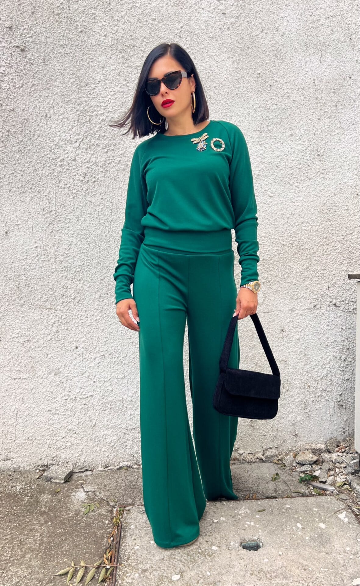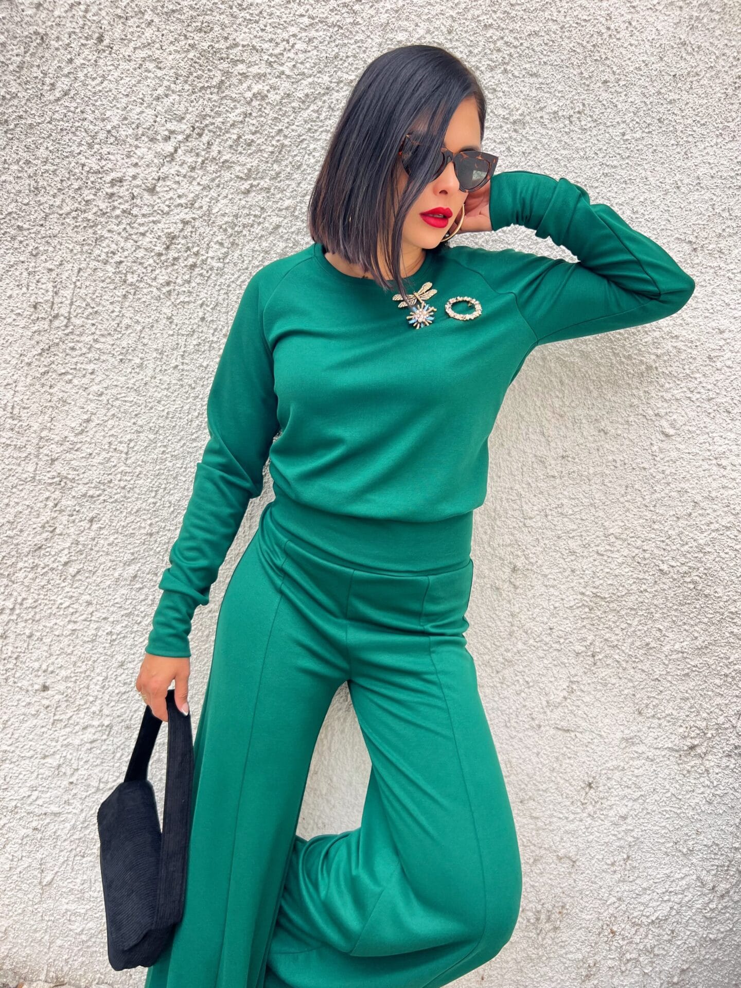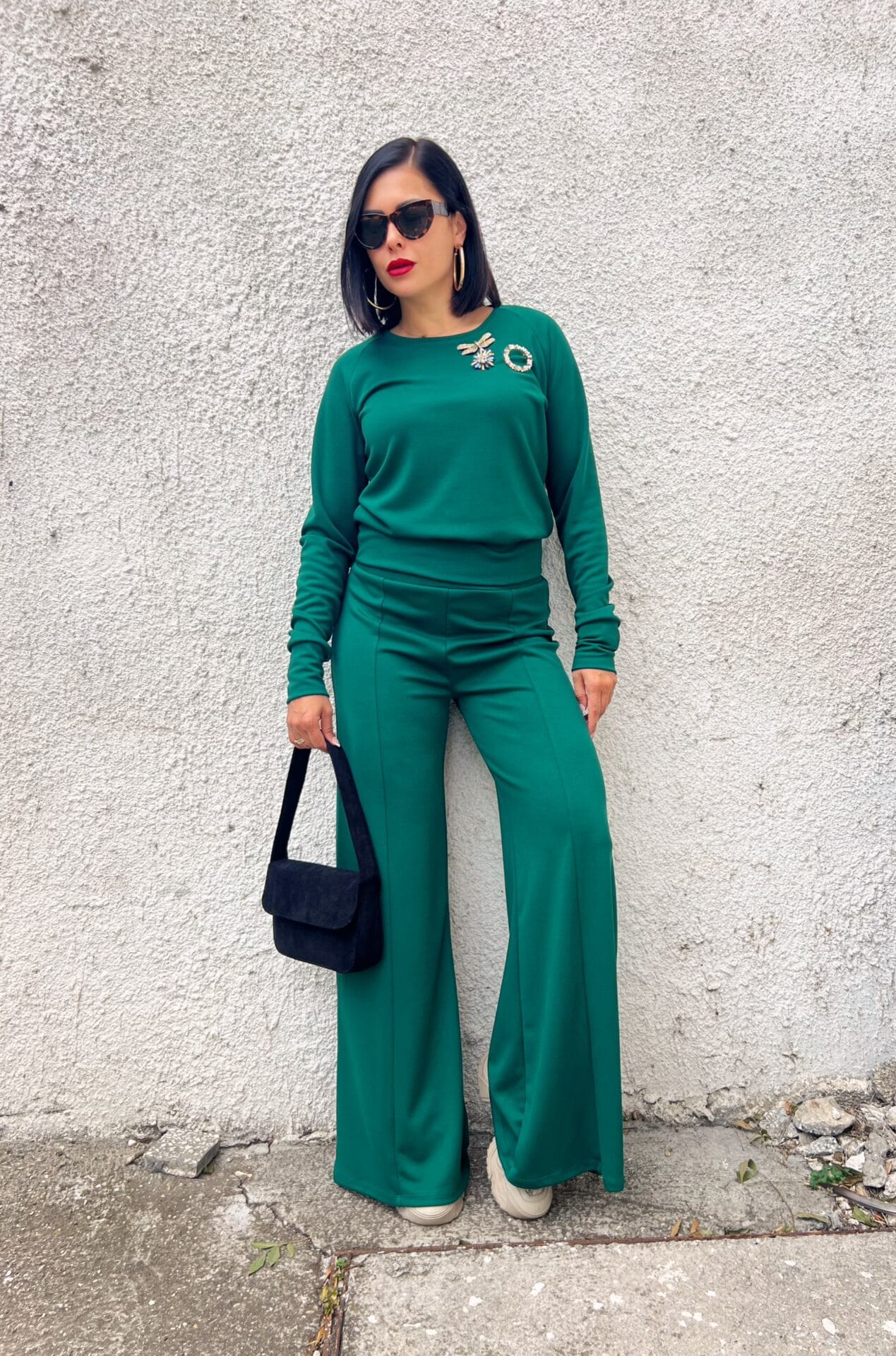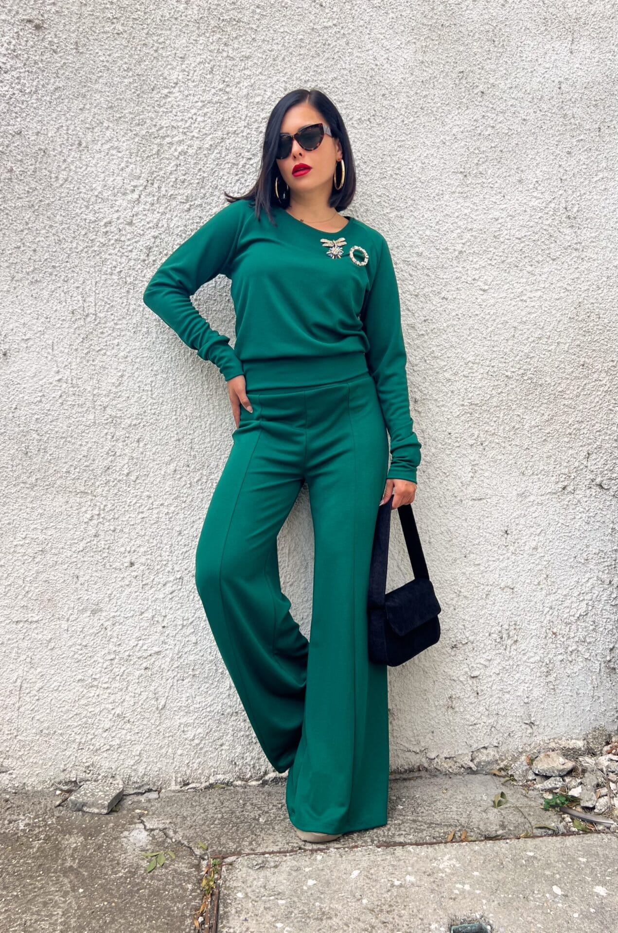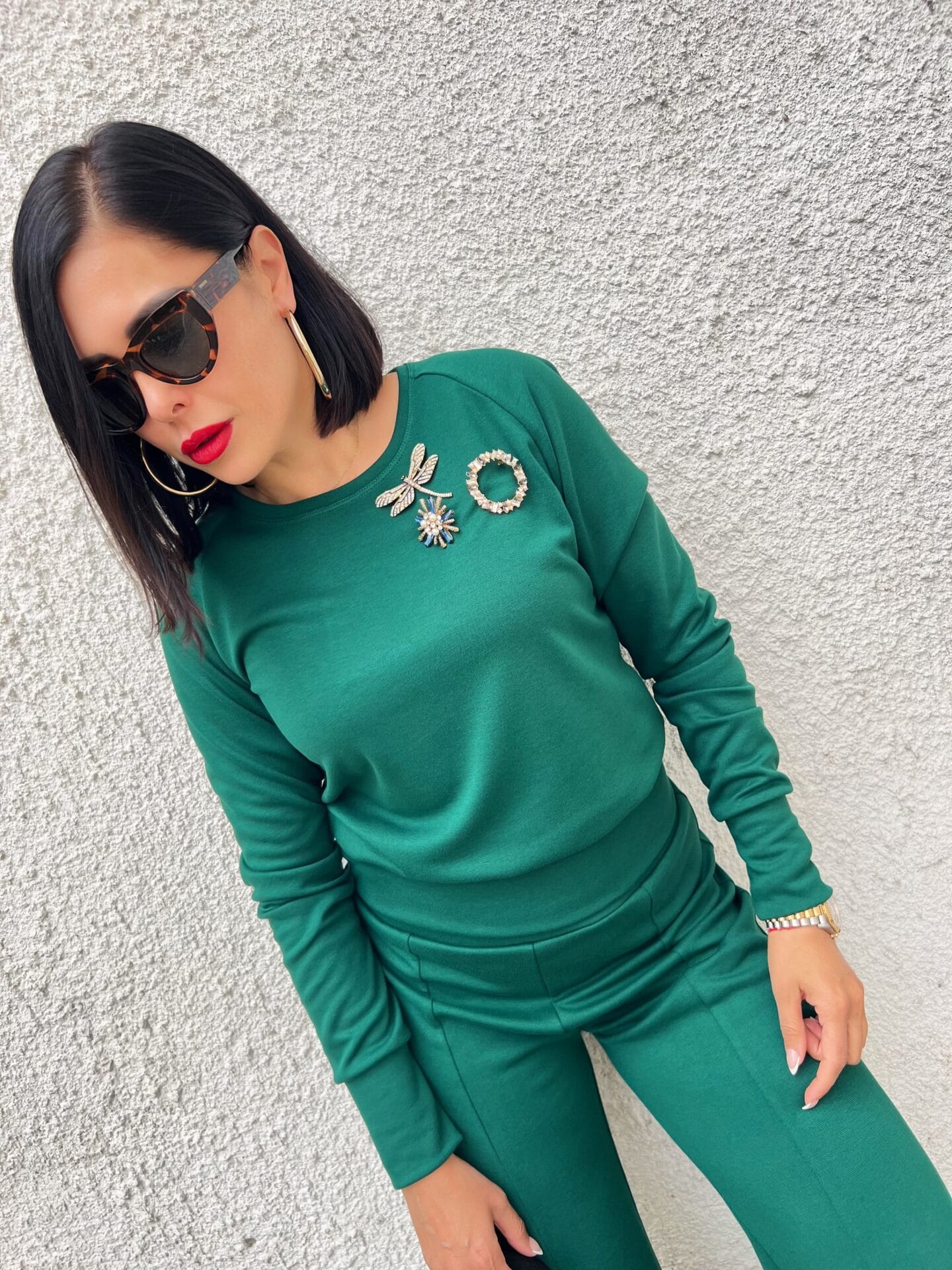 Дамски комплект – панталон и блуза, декорирана с брошки.
