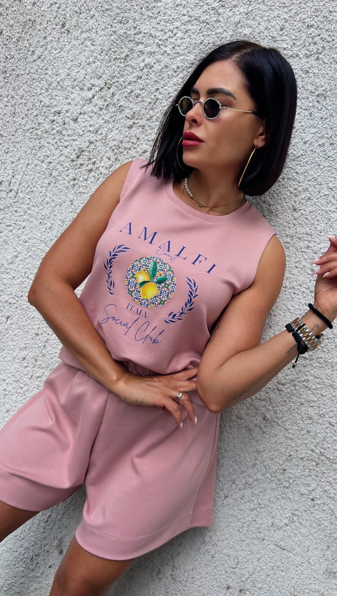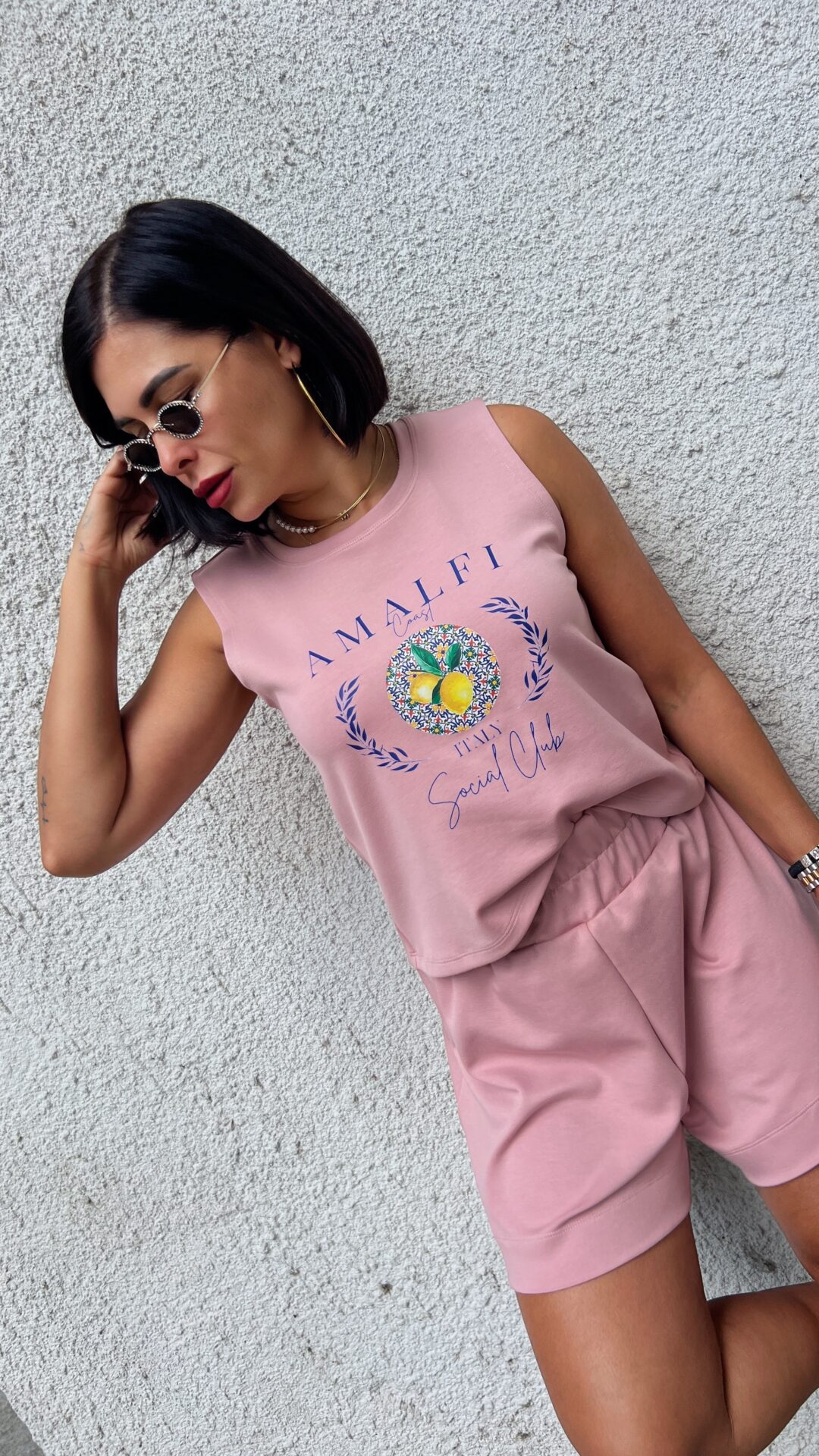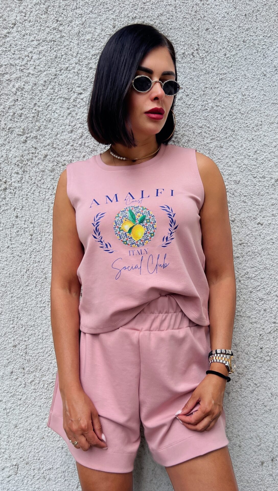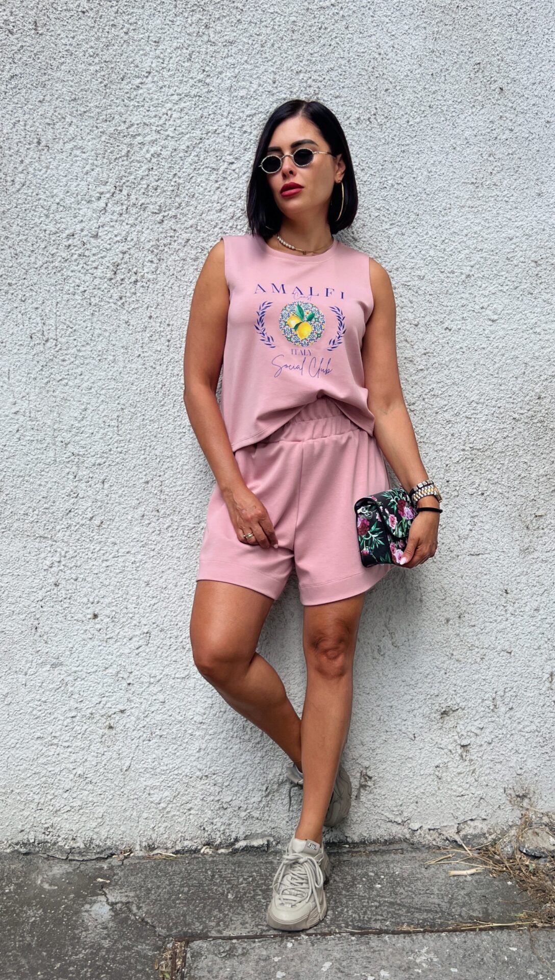 Дамски комплект – къси панталонки и потник в пудрено розов цвят.