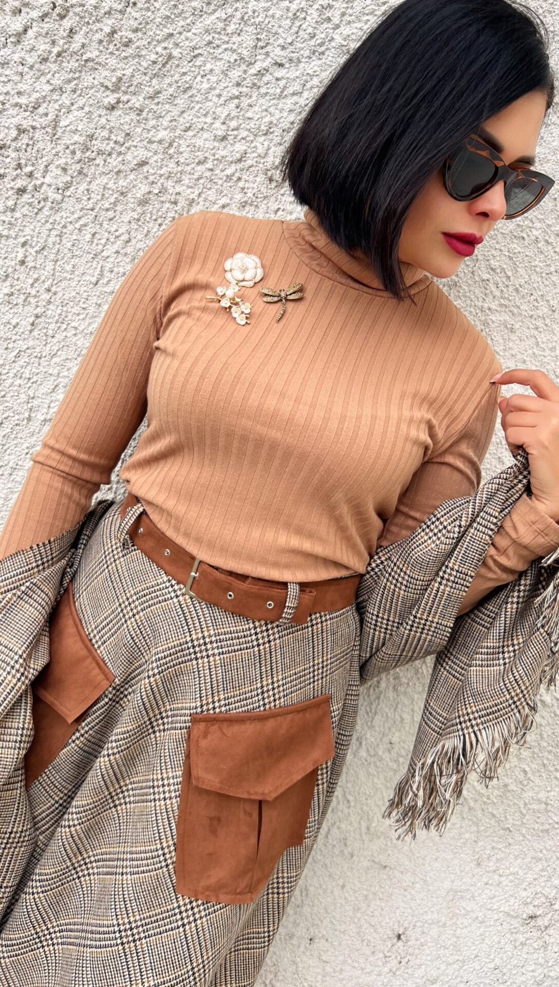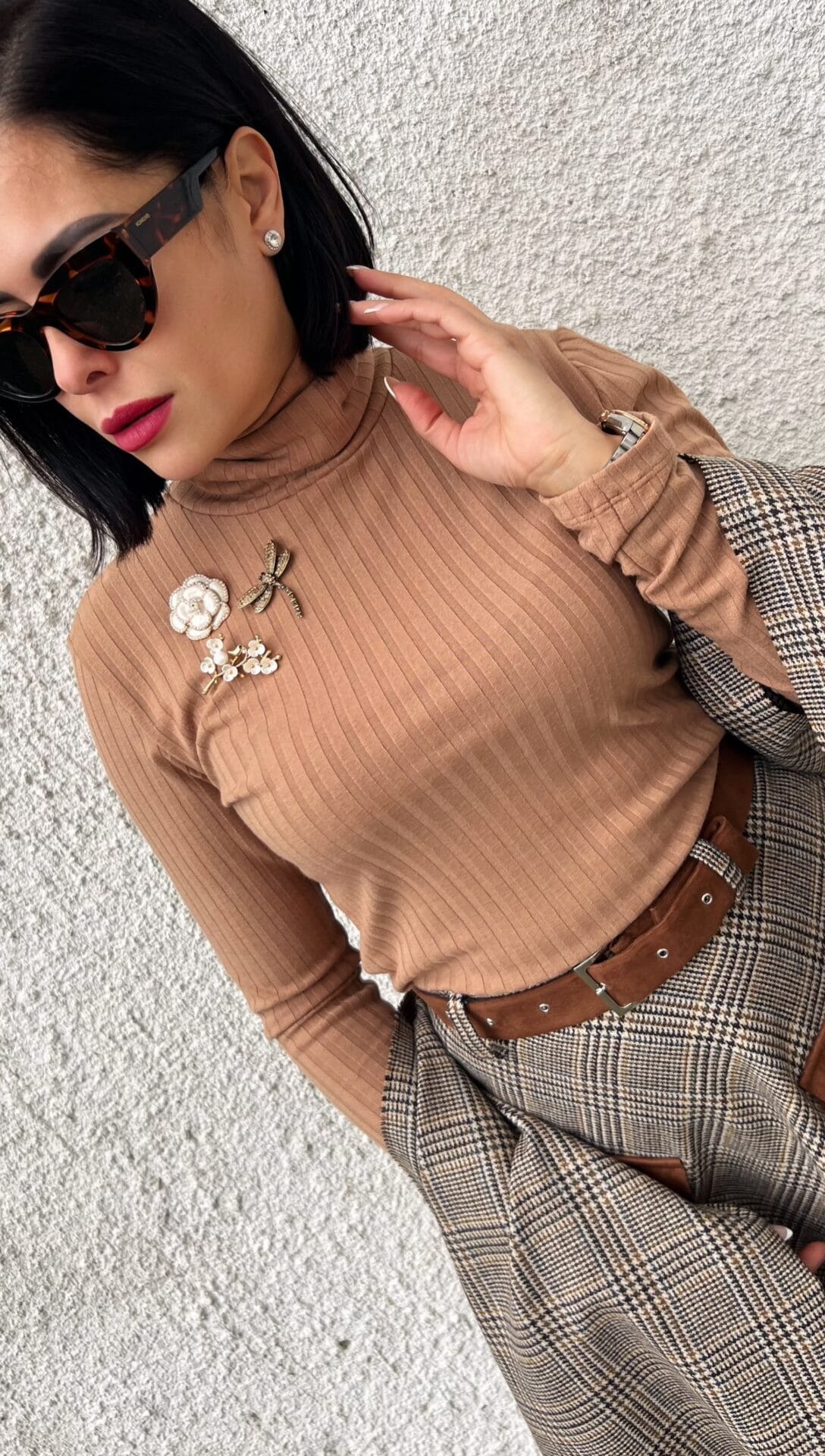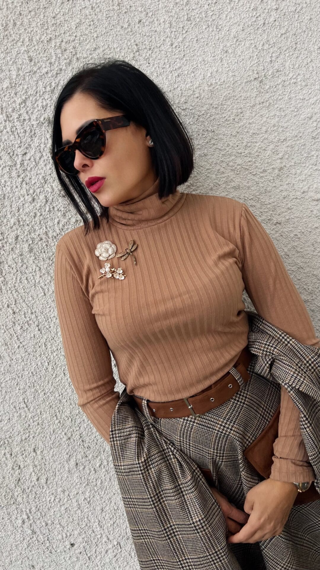 Поло с дълъг ръкав в модерен сезонен цвят, декорирано със сет красиви брошки.