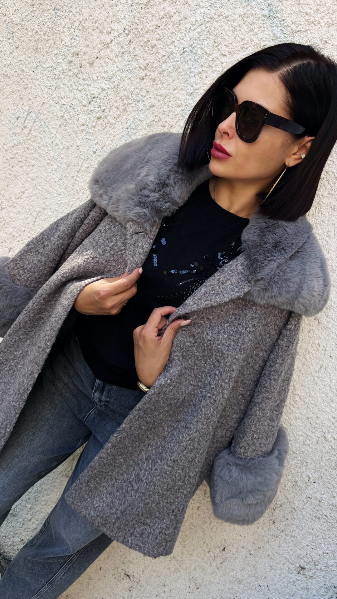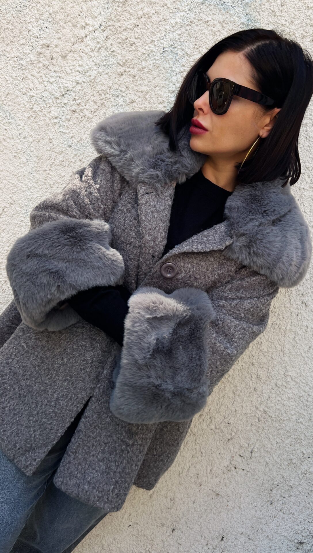 Елегантно пухкаво дамско палто с пух на яката и ръкавите. Закопчаване с копчета.