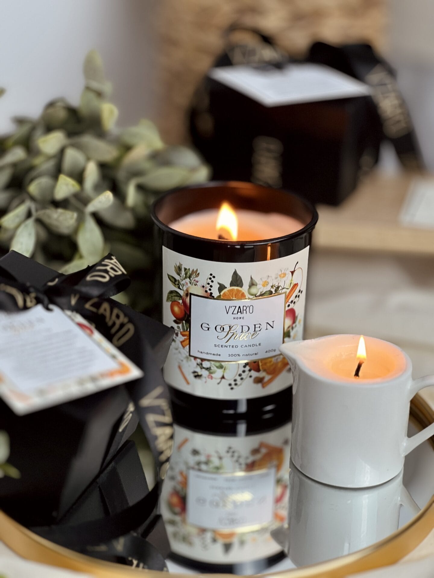 – ароматна свещ “Golden Spice” – Oтпуснете се с очарователния ориенталски аромат на нашата свещ, напоена с първокласна френска парфюмна композиция.