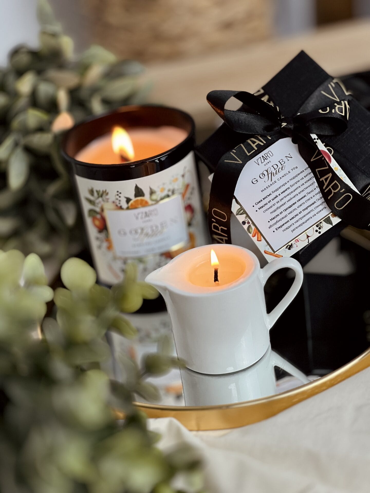 – масажна свещ “Golden Spice” – 70гр. – съдържаща изцяло натурални продукти. Подобрете релаксацията си и превърнете дома си в луксозен СПА център. Освежава и повдига настроението, хидратира и стимулира регенерацията на кожата, създавайки уютна и ароматна атмосфера.