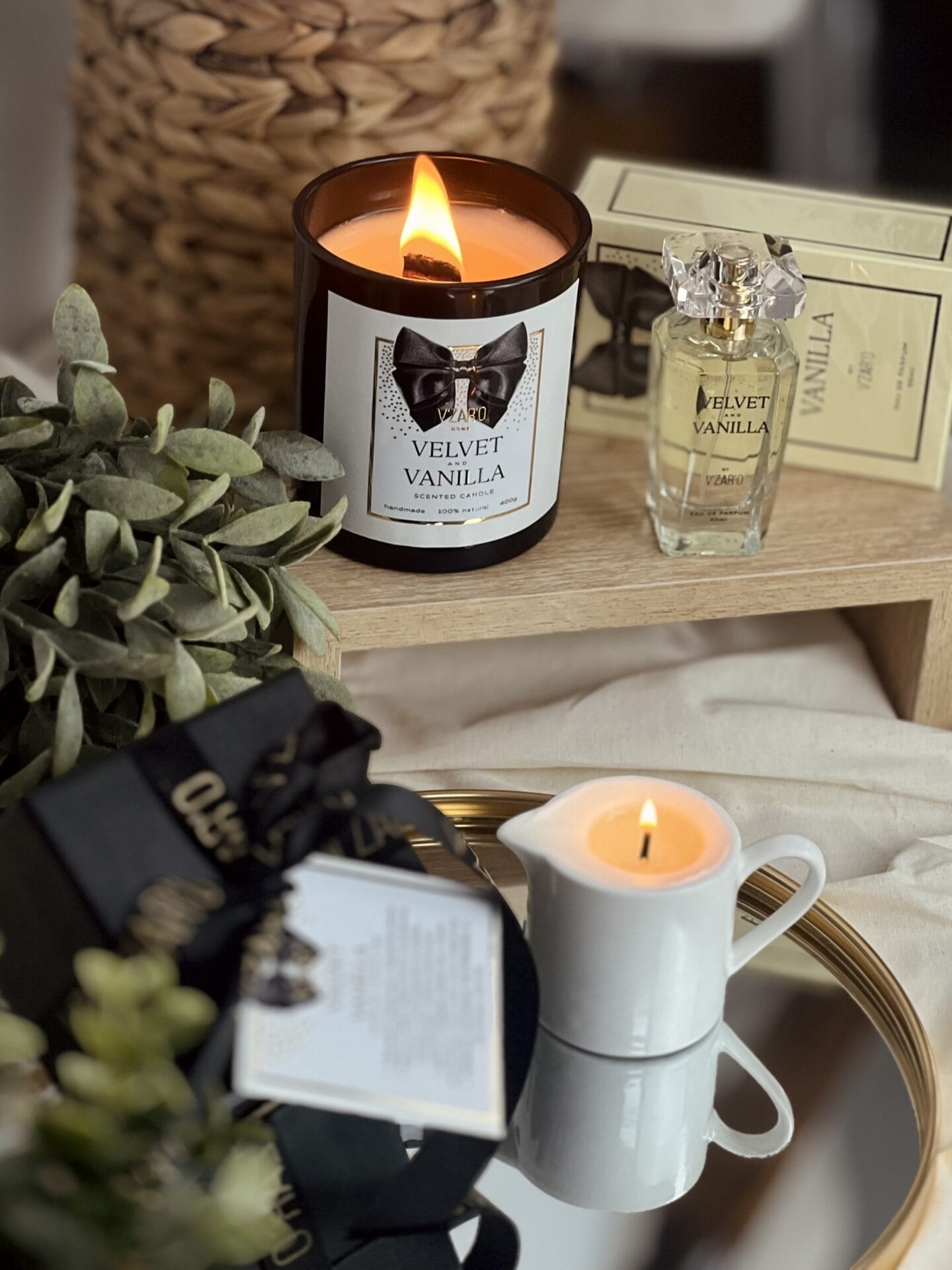 – ароматна свещ “Velvet & Vanilla” – Oтпуснете се с очарователния ориенталски аромат на нашата свещ, напоена с първокласна френска парфюмна композиция.